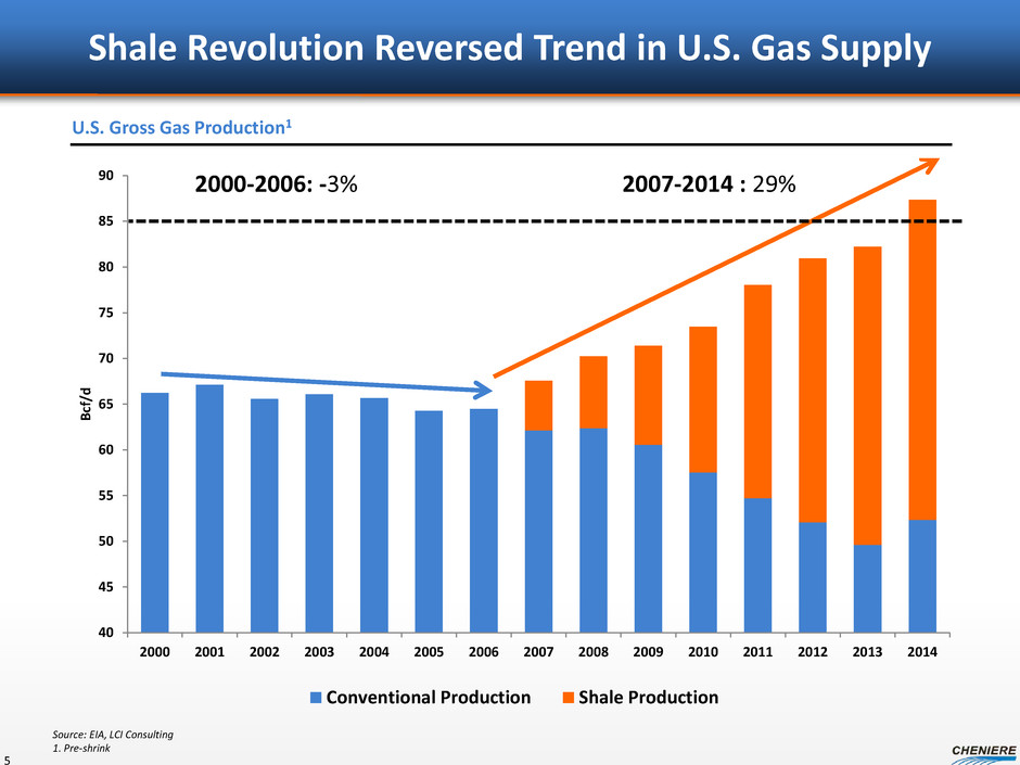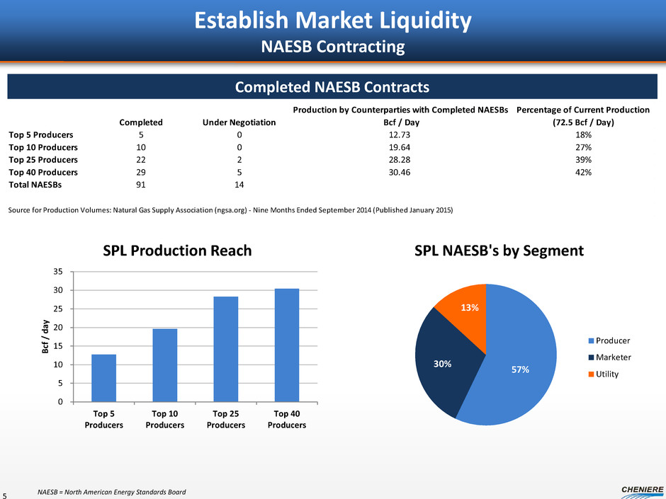 Criteria for LNG Export Projects 4 Proposing 2 more liquefaction trains at one of our sites We would possibly back other developers (small-scale LNG projects) Consideration: Cheniere: Land Can assess in a few days Pipeline access Gas supply team Regulatory requirements Full staff Engineering choices 100+ engineers on staff Marketing capacity Constantly talking to customers Capital needs Proven track record The “machine” is built: low hanging fruit
