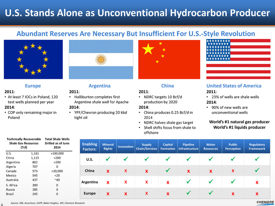 U.S. Stands Alone as Unconventional Hydrocarbon Producer 6 Technically Recoverable Shale Gas Resources (Tcf) Total Shale Wells Drilled as of June 2014 U.S. 1,161 >100,000 China 1,115 >200 Argentina 802 >200 Algeria 707 0 Canada 573 >20,000 Mexico 545 <20 Australia 437 ~40 S. Africa 390 0 Russia 285 0 Brazil 245 0 Source: ARI, Accenture, CAPP, Baker Hughes, API, Cheniere Research Enabling Factors: Mineral Rights Innovation Supply Chain/Services Capital Formation Pipeline Infrastructure Water Resources Public Perception Regulatory Framework U.S. China x X x x x X Argentina x X X x x Europe x x X x x x Europe 2011: • At least 7 IOCs in Poland, 120 test wells planned per year 2014: • COP only remaining major in Poland Argentina 2011: • Halliburton completes first Argentine shale well for Apache 2014: • YPF/Chevron producing 20 kbd tight oil China 2011: • NDRC targets 10 Bcf/d production by 2020 2014: • China produces 0.25 Bcf/d in 2014 • NDRC halves shale gas target • Shell shifts focus from shale to offshore United States of America 2011: • 23% of wells are shale wells 2014: • 90% of new wells are unconventional wells Abundant Reserves Are Necessary But Insufficient For U.S.-Style Revolution World’s #1 natural gas producer World’s #1 liquids producer