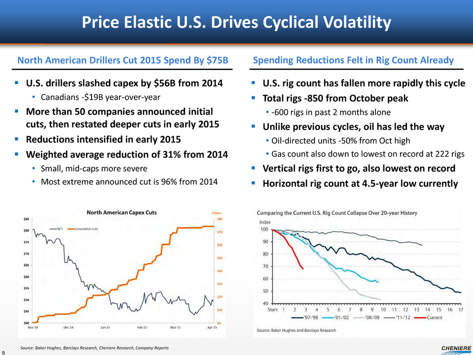 Price Elastic U.S. Drives Cyclical Volatility 9 U.S. drillers slashed capex by $56B from 2014 • Canadians -$19B year-over-year More than 50 companies announced initial cuts, then restated deeper cuts in early 2015 Reductions intensified in early 2015 Weighted average reduction of 31% from 2014 • Small, mid-caps more severe • Most extreme announced cut is 96% from 2014 U.S. rig count has fallen more rapidly this cycle Total rigs -850 from October peak • -600 rigs in past 2 months alone Unlike previous cycles, oil has led the way • Oil-directed units -50% from Oct high • Gas count also down to lowest on record at 222 rigs Vertical rigs first to go, also lowest on record Horizontal rig count at 4.5-year low currently Spending Reductions Felt in Rig Count Already North American Drillers Cut 2015 Spend By $75B Source: Baker Hughes, Barclays Research, Cheniere Research, Company Reports