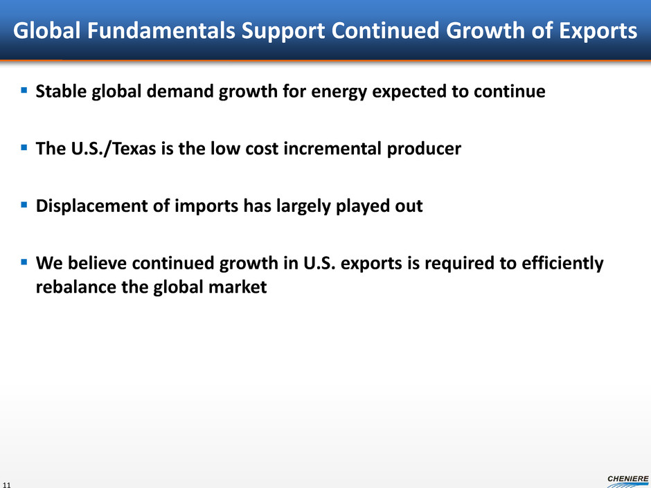 Swing Producer U.S. Reacts, Rest of the World Does Not 10 $0 $25 $50 $75 $100 $125 $150 0 500 1,000 1,500 2,000 1997 2000 2003 2006 2009 2012 2015 Rig Activity Vs. Brent Price Brent U.S. Rigs International Rigs 0 1 2 3 4 5 6 7 8 9 10 2009 2010 2011 2012 2013 2014 2015 US Crude Production Wedge Growing 2.1M bpd Sources: EIA, Baker Hughes, Cheniere Research Unconventional Declines Unprecedented ROW Rig Response Has Been Muted Ex-North America almost unfazed by bust • ROW just -33 rigs since October • Middle East, Africa added rigs Internationals mimic past cycles • No drastic change of pace in 1998, 2002 or 2008 • Saudi signaling no cuts to production U.S. supply expected to be quicker to react to changes in activity Estimates of Year 1 declines of around 2.1 MMbpd U.S. taking role of world’s swing producer Rigs Brent Legacy Production Million b/d Annual Supply Additions