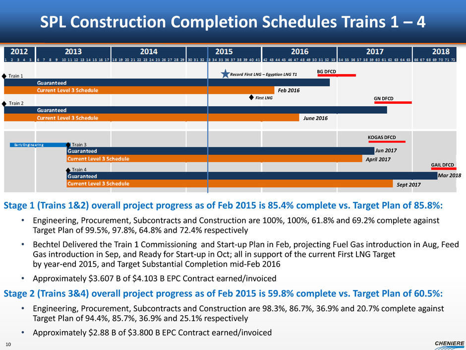 Sabine Pass Liquefaction Project Execution Keys to Success World class terminal site • Deep channel in close proximity to the coast • Sufficient acreage to satisfy siting challenges, both regulatory and physical World class contractor • Bechtel has constructed one third of the world’s liquefaction facilities • Long, successful relationship between Cheniere and Bechtel • LSTK EPC Agreements where Bechtel generally bears cost, schedule & performance risk • Work proceeding on budget and well ahead of schedule guarantees World class engineering and operations team • Over 1,050 years of experience in oil and gas facility construction • Over 560 years of LNG experience • On site O&M Team currently at 240 persons; expect to exit 2015 at ~310 • 30+ operating employees with liquefaction experience from Trinidad, Angola, Egypt, Qatar, Peru, Oman, etc.; over 11 years each, on average 13
