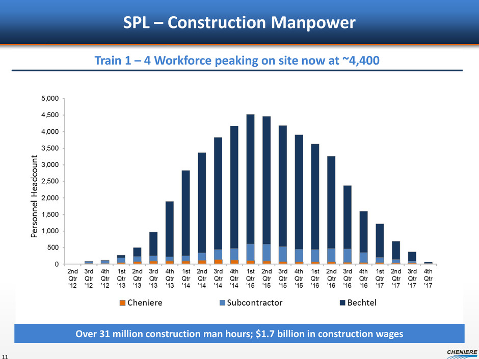 SPL Construction Completion Schedules Trains 1 – 4 Stage 1 (Trains 1&2) overall project progress as of Feb 2015 is 85.4% complete vs. Target Plan of 85.8%: • Engineering, Procurement, Subcontracts and Construction are 100%, 100%, 61.8% and 69.2% complete against Target Plan of 99.5%, 97.8%, 64.8% and 72.4% respectively • Bechtel Delivered the Train 1 Commissioning and Start-up Plan in Feb, projecting Fuel Gas introduction in Aug, Feed Gas introduction in Sep, and Ready for Start-up in Oct; all in support of the current First LNG Target by year-end 2015, and Target Substantial Completion mid-Feb 2016 • Approximately $3.607 B of $4.103 B EPC Contract earned/invoiced Stage 2 (Trains 3&4) overall project progress as of Feb 2015 is 59.8% complete vs. Target Plan of 60.5%: • Engineering, Procurement, Subcontracts and Construction are 98.3%, 86.7%, 36.9% and 20.7% complete against Target Plan of 94.4%, 85.7%, 36.9% and 25.1% respectively • Approximately $2.88 B of $3.800 B EPC Contract earned/invoiced 10 BG DFCD GN DFCD KOGAS DFCD GAIL DFCD Record First LNG – Egyptian LNG T1 First LNG Train 1 Train 2 Train 3 Train 4 Feb 2016 April 2017 Jun 2017 Mar 2018 June 2016 Sept 2017
