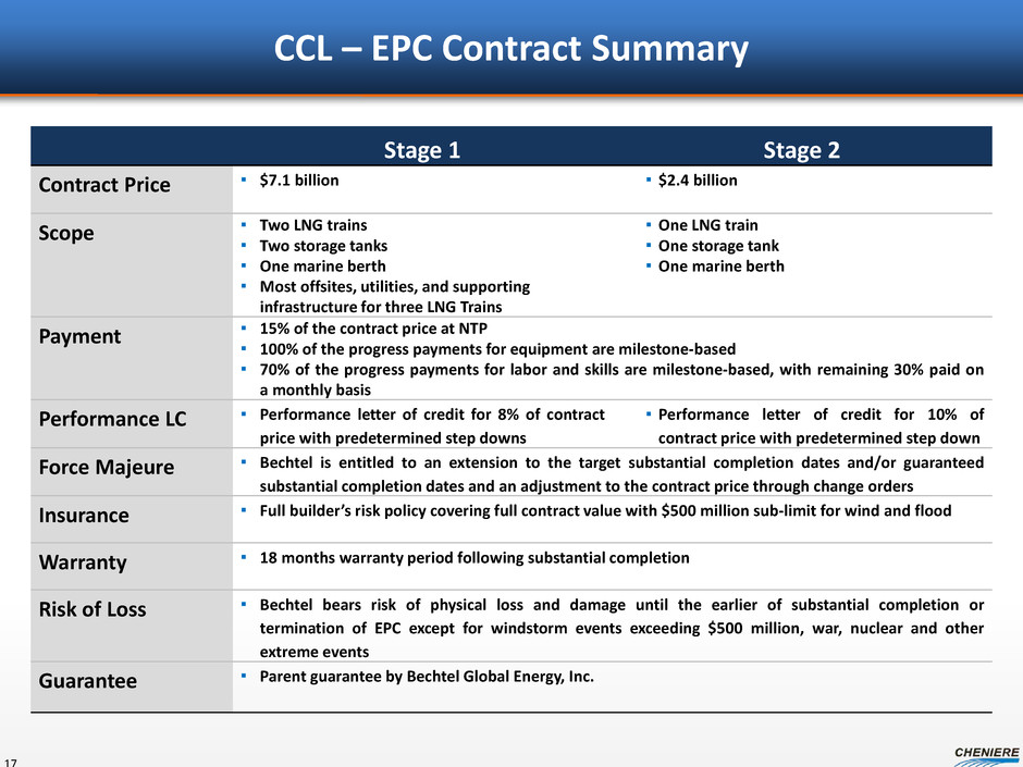 $1.7 $0.7 $0.6 $0.4 $0.4 $0.3 $0.1 $0.4 $0.5 $2.2 $1.5 $1.4 $2.4 - $3.0 $0.8 - $1.0 $0.5 - $1.0 $3.7 - $5.1 – $1.0 $2.0 $3.0 $4.0 $5.0 $6.0 $7.0 CE I E B IT D A ( $ in b ill io ns ) Estimated CEI EBITDA Build Up SPL Trains 1-6 and CCL Trains 1-3 16 Number of trains 7 trains 8 trains 9 trains Nameplate capacity 31.5 MTPA 36.0 MTPA 40.5 MTPA Long term SPA volumes 27.4 MTPA 30.25 MTPA 31.75 MTPA CMI portfolio volumes 4.1 MTPA 5.75 MTPA 8.75 MTPA Assumed CMI LNG gross margin $4.00 - $7.00/MMBtu Note: EBITDA is a non-GAAP measure. EBITDA is computed as total revenues less non-cash deferred revenues, operating expenses, assumed commissioning costs and state and local taxes. It does not include depreciation expenses and certain non-operating items. Because we have not forecasted depreciation expense and non-operating items, we have not made any forecast of net income, which would be the most directly comparable financial measure under generally accepted accounting principles, or GAAP, and we are unable to reconcile differences between forecasts of EBITDA and net income. EBITDA has limitations as an analytical tool and should not be considered in isolation or in lieu of an analysis of our results as reported under GAAP, and should be evaluated only on a supplementary basis. Cumulative build up CCL T3 (LT SPA) SPL T1-5, CCL T1-2 (LT SPA) SPL T6 (LT SPA) CMI Sales Total
