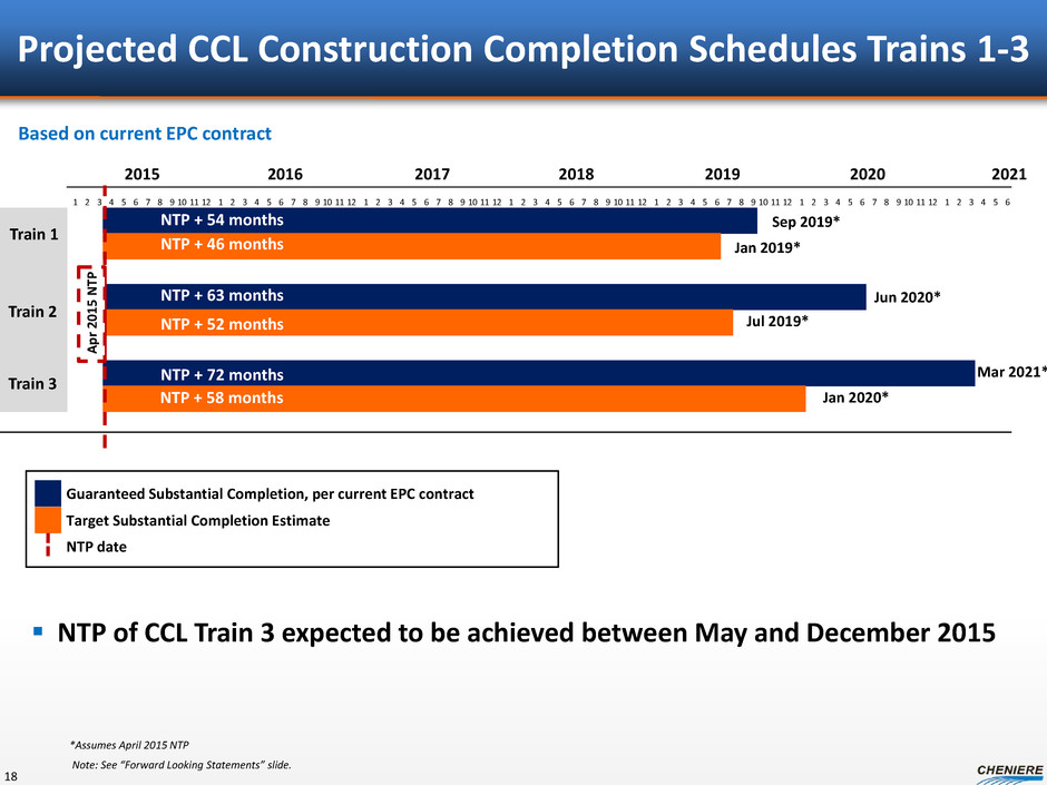 2015 2016 2017 2018 2019 2020 2021 1 2 3 4 5 6 7 8 9 10 11 12 1 2 3 4 5 6 7 8 9 10 11 12 1 2 3 4 5 6 7 8 9 10 11 12 1 2 3 4 5 6 7 8 9 10 11 12 1 2 3 4 5 6 7 8 9 10 11 12 1 2 3 4 5 6 7 8 9 10 11 12 1 2 3 4 5 6 Projected CCL Construction Completion Schedules Trains 1-3 18 Note: See “Forward Looking Statements” slide. A pr 2 01 5 N TP Sep 2019* Jan 2019* Jul 2019* Jun 2020* Jan 2020* Mar 2021* NTP + 54 months NTP + 46 months NTP + 63 months NTP + 52 months NTP + 72 months NTP + 58 months Guaranteed Substantial Completion, per current EPC contract Target Substantial Completion Estimate NTP date NTP of CCL Train 3 expected to be achieved between May and December 2015 *Assumes April 2015 NTP 2015 2016 2017 2018 2019 2020 2021 Train 1 Train 2 Train 3 Based on current EPC contract