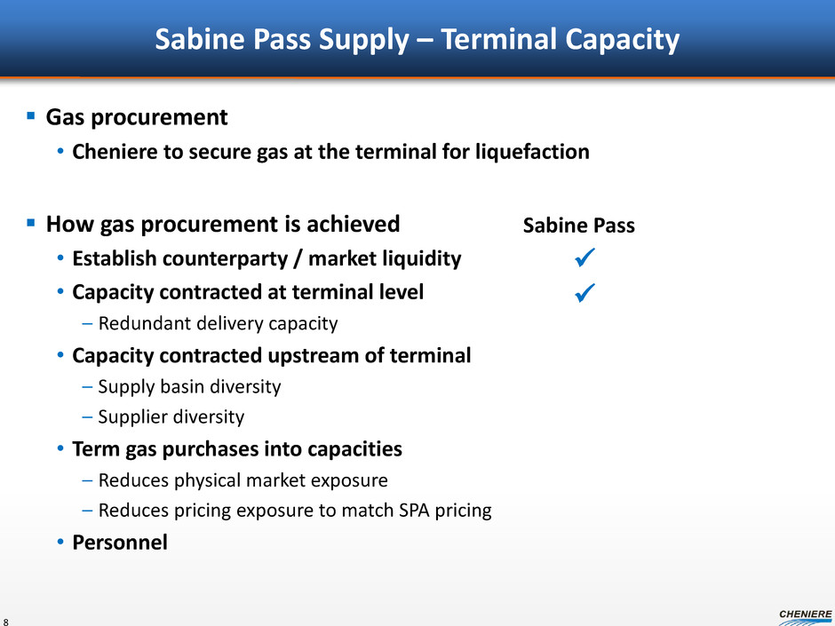 - 1,000,000 2,000,000 3,000,000 4,000,000 5,000,000 Nov-15 Nov-16 Nov-17 Nov-18 Nov-19 Nov-20 FT Contracted Total Load NGPL Capacity SPL Contracted Terminal Transportation 7 Pipeline Capacity by Train Train 1 Train 2 Train 3 Train 4 Train 5 Train 6 D th /d (1)Anticipated total load per train estimated at 0.65 Bcf/d annually (1) Pipeline Volume (Dth/d) Comments Pipeline Volume (Dth/d) Comments Creole Trail 1,530,000 Volume is 765,000 Dth/d for Train 1 Transco 1,200,000 Volume is 1,200,000 Dth/d for Train 3 NGPL 550,000 Volume is 375,000 Dth/d for Train 1, increasing to 550,000 Dth/d for Train 2 KMLP 1,200,000 SPL has the option to elect 600,000 Dth/d per train for Trains 5 and 6.