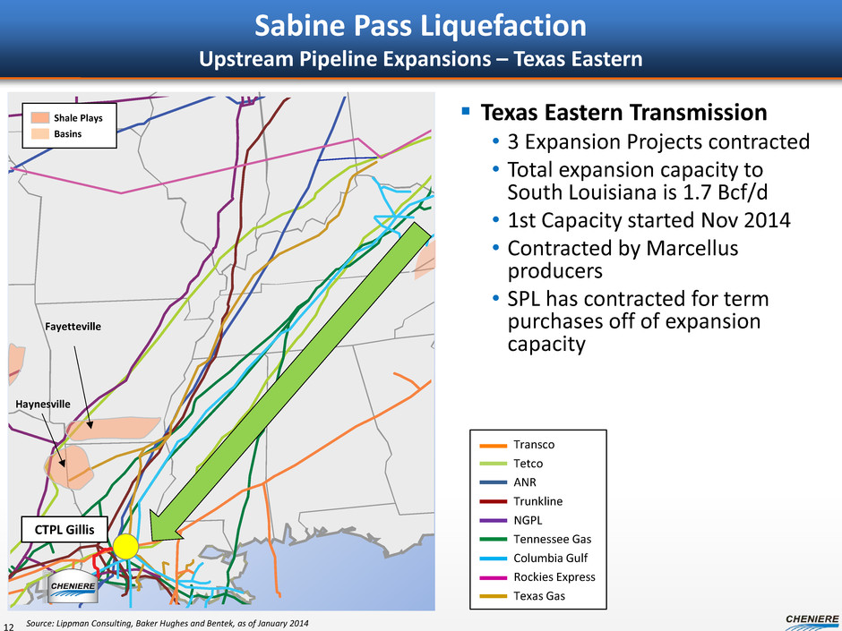 Sabine Pass Liquefaction Upstream Pipeline Expansions – Texas Eastern Texas Eastern Transmission • 3 Expansion Projects contracted • Total expansion capacity to South Louisiana is 1.7 Bcf/d • 1st Capacity started Nov 2014 • Contracted by Marcellus producers • SPL has contracted for term purchases off of expansion capacity 12 Transco Tetco ANR Trunkline NGPL Tennessee Gas Columbia Gulf Rockies Express Texas Gas Source: Lippman Consulting, Baker Hughes and Bentek, as of January 2014 Haynesville Fayetteville CTPL Gillis Shale Plays Basins Haynesville