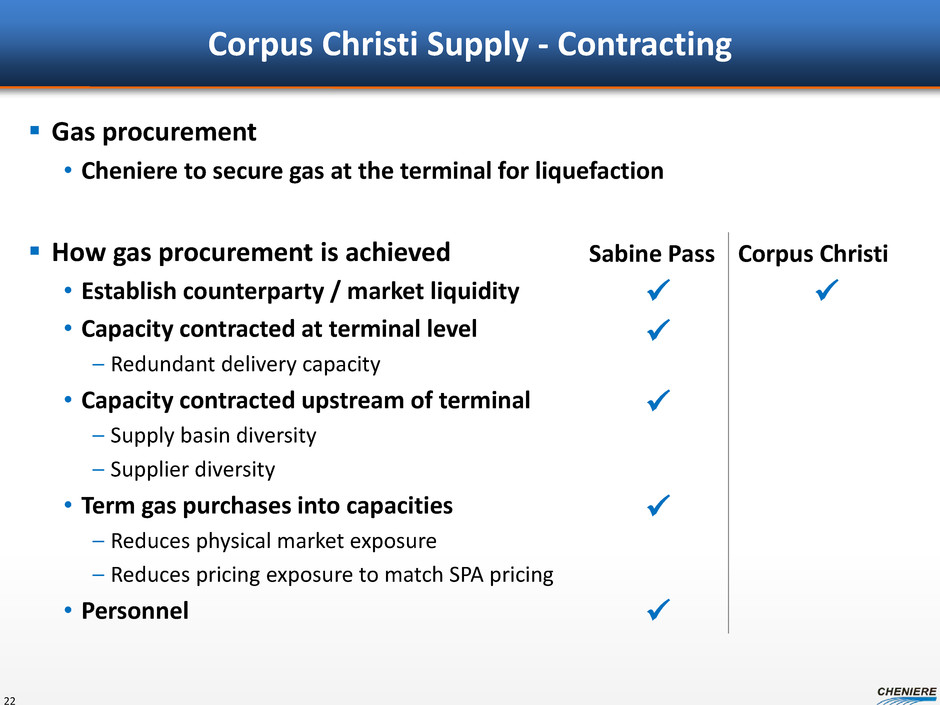 Corpus Christi Counterparty Contracting Current Actions • Have contracted some “Texas-only” producers that can’t get to SPL • Replicating supply strategy executed in SPL for CCL volumes Plan for 2015 • After achieving FID, will start similar process for obtaining NAESBs as SPL • Plan to have achieved contracting by end of 2015 21