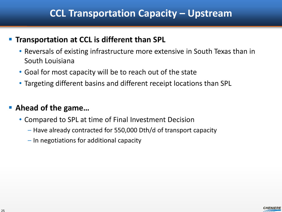 Annual Gross Profit from 2 mtpa 24 Assumptions $5 Henry Hub Price $15 LNG sales price, delivered at terminal 6% loss of gas on the vessel Cheniere vessels: $84,000 per day average charter rate Port / Canal costs: $900,000 per voyage 1 incremental vessel needed at $100,000 per day Financing costs: $250,000 per cargo for LCs at L+250 Volumes LNG Loaded Sabine Pass (Tbtu) 104 LNG Delivered DES (Tbtu) 98 Cash Flows Sales Total Revenue ($MM) 1,466$ Expenses LNG purchase from Sabine (598) Vessel Charter Costs (92) Port and Canal Costs (25) Incremental Vessel Charters (37) Financing Costs (7) Gross Profit ($MM) 707$ Gross Profit ($/MMBtu) 6.80$