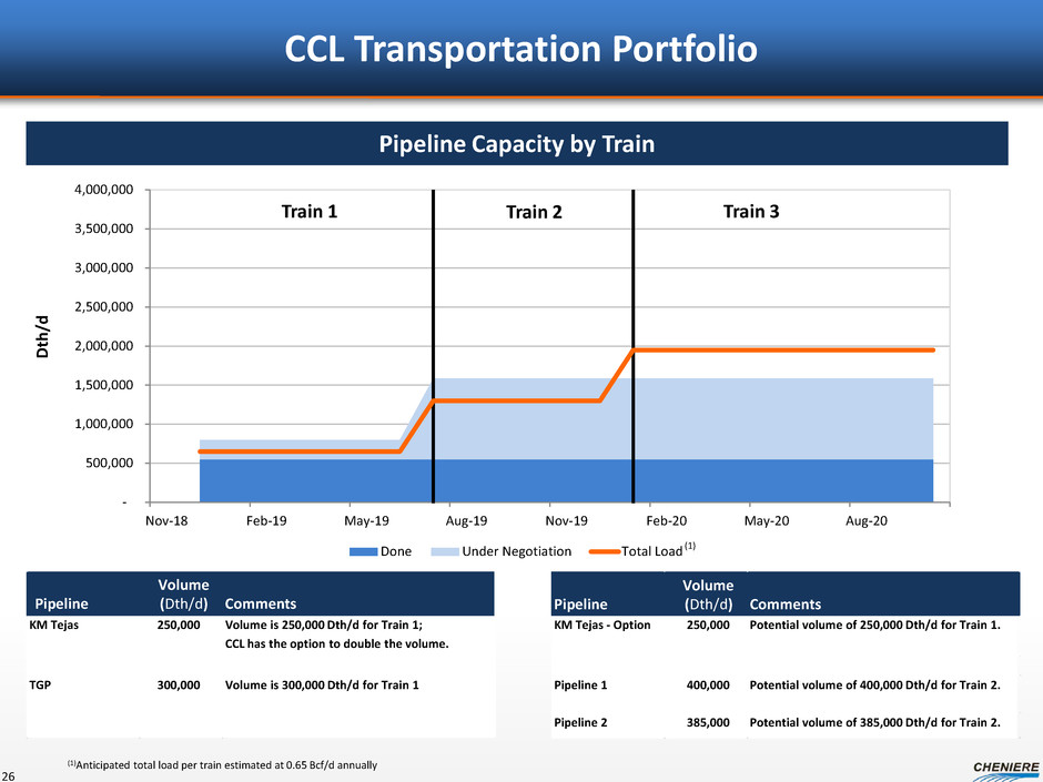 CCL Transportation Capacity – Upstream Transportation at CCL is different than SPL • Reversals of existing infrastructure more extensive in South Texas than in South Louisiana • Goal for most capacity will be to reach out of the state • Targeting different basins and different receipt locations than SPL Ahead of the game… • Compared to SPL at time of Final Investment Decision – Have already contracted for 550,000 Dth/d of transport capacity – In negotiations for additional capacity 25