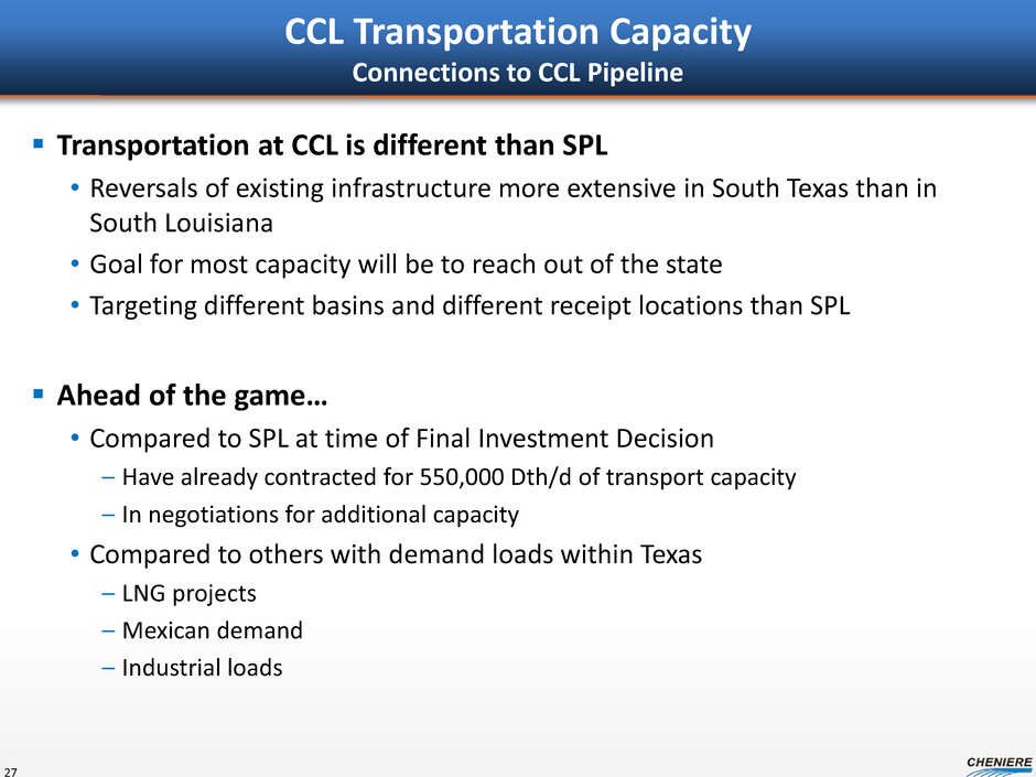 - 500,000 1,000,000 1,500,000 2,000,000 2,500,000 3,000,000 3,500,000 4,000,000 Nov-18 Feb-19 May-19 Aug-19 Nov-19 Feb-20 May-20 Aug-20 Done Under Negotiation Total Load CCL Transportation Portfolio 26 Pipeline Capacity by Train (1)Anticipated total load per train estimated at 0.65 Bcf/d annually Train 1 Train 2 Train 3 D th /d (1) Pipeline Volume (Dth/d) Comments Pipeline Volume (Dth/d) Comments KM Tejas 250,000 Volume is 250,000 Dth/d for Train 1; CCL has the option to double the volume. KM Tejas - Option 250,000 Potential volume of 250,000 Dth/d for Train 1. TGP 300,000 Volume is 300,000 Dth/d for Train 1 Pipeline 1 400,000 Potential volume of 400,000 Dth/d for Train 2. Pipeline 2 385,000 Potential volume of 385,000 Dth/d for Train 2.