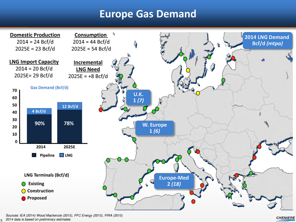 Europe Gas Demand LNG Terminals (Bcf/d) Existing Construction Proposed Sources: IEA (2014) Wood Mackenzie (2015), PFC Energy (2015), PIRA (2015) 2014 data is based on preliminary estimates 5.03 Europe-Med 2 (18) W. Europe 1 (6) U.K. 1 (7) LNG Import Capacity 2014 = 20 Bcf/d 2025E= 29 Bcf/d Consumption 2014 = 44 Bcf/d 2025E = 54 Bcf/d Incremental LNG Need 2025E = +8 Bcf/d Domestic Production 2014 = 24 Bcf/d 2025E = 23 Bcf/d Gas Demand (Bcf/d) Pipeline 70 60 50 40 30 20 10 0 2014 2025E Pipeline LNG 78% 90% 12 Bcf/d 4 Bcf/d 2014 LNG Demand Bcf/d (mtpa) 5