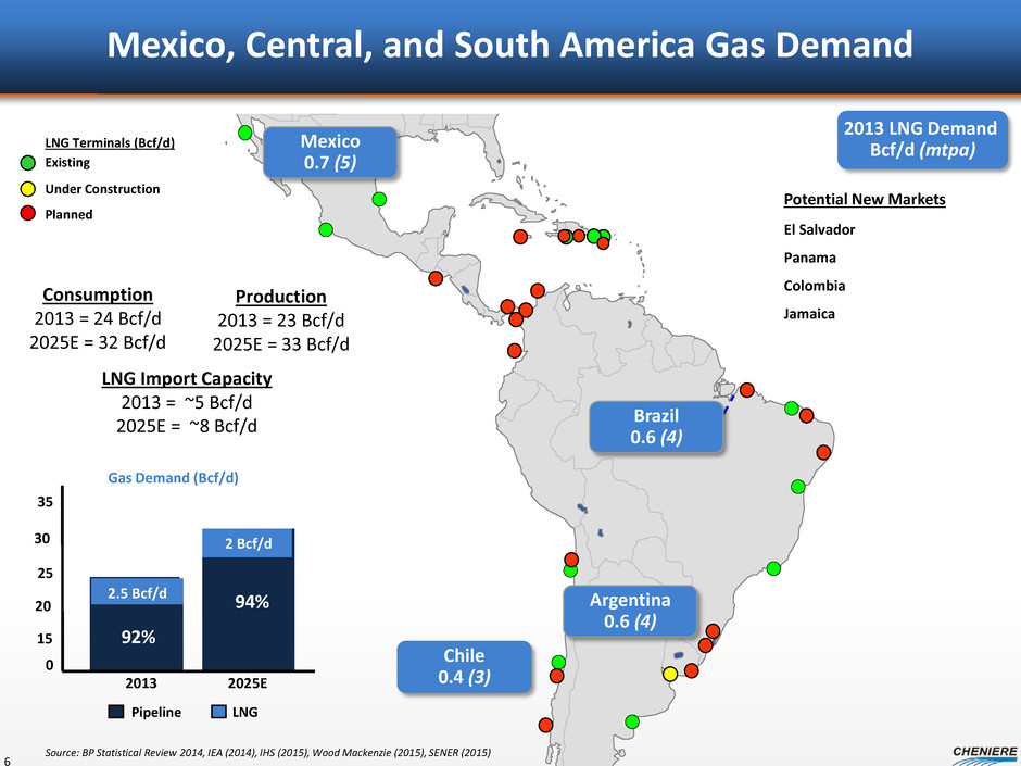 Mexico, Central, and South America Gas Demand Source: BP Statistical Review 2014, IEA (2014), IHS (2015), Wood Mackenzie (2015), SENER (2015) Gas Demand (Bcf/d) Pipeline 35 30 25 15 0 2013 2025E Pipeline LNG 94% 88% 2 Bcf/d LNG Import Capacity 2013 = ~5 Bcf/d 2025E = ~8 Bcf/d Consumption 2013 = 24 Bcf/d 2025E = 32 Bcf/d Brazil 0.6 (4) Argentina 0.6 (4) Chile 0.4 (3) Production 2013 = 23 Bcf/d 2025E = 33 Bcf/d LNG Terminals (Bcf/d) Existing Under Construction Planned Potential New Markets El Salvador Panama Colombia Jamaica Mexico 0.7 (5) 94% 92% 2 cf/d 2.5 Bcf/d 20 2013 LNG Demand Bcf/d (mtpa) 6