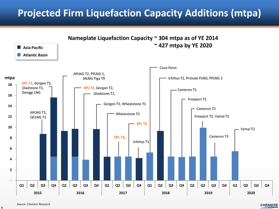 Projected Firm Liquefaction Capacity Additions (mtpa) 9 Source: Cheniere Research Nameplate Liquefaction Capacity ~ 304 mtpa as of YE 2014 ~ 427 mtpa by YE 2020 Asia Pacific Atlantic Basin SPL T1, Gorgon T1, Gladstone T1, Donggi LNG Gorgon T3, Wheatstone T1 APLNG T2, PFLNG 1, MLNG Tiga T9 Wheatstone T2 Gladstone T2, SPL T4 Freeport T1 Ichthys T2, Prelude FLNG, PFLNG 2 Yamal T2 SPL T2, Gorgon T2, Ichthys T1 mtpa APLNG T1, QCLNG T2 Cameron T1 Cameron T2 Cameron T3 Freeport T2, Yamal T1 Cove Point - 2 4 6 8 10 12 14 16 18 Q1 Q2 Q3 Q4 Q1 Q2 Q3 Q4 Q1 Q2 Q3 Q4 Q1 Q2 Q3 Q4 Q1 Q2 Q3 Q4 Q1 Q2 Q3 Q4 2015 2016 2017 2018 2019 2020
