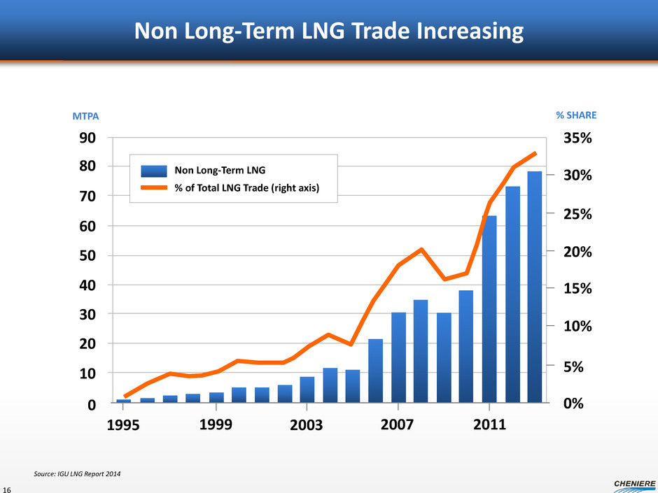 HH Index + Fixed Price is less volatile than Brent index 15 Source: Bloomberg; Cheniere $6.88 $8.23 $9.57 $10.91 $12.26 $13.60 $14.94 $16.29 $17.63 $18.97 $/mmBtu Distribution of HH Indexed LNG and Brent Indexed LNG assuming equivalent means and current implied volatility 14.5%*Brent = Mean:11.6, StdDev: 1.5, Brent MonthAhead: $80.0/Bbl Volatility MonthAhead: 44.3% % HH + Fixed Price / MMBtu = Mean:11.6, StdDev: 0.7, HenryHub MonthAhead: $4.0/mmBtu Volatility MonthAhead: 42.8% HH Index + Fixed Component Brent Index