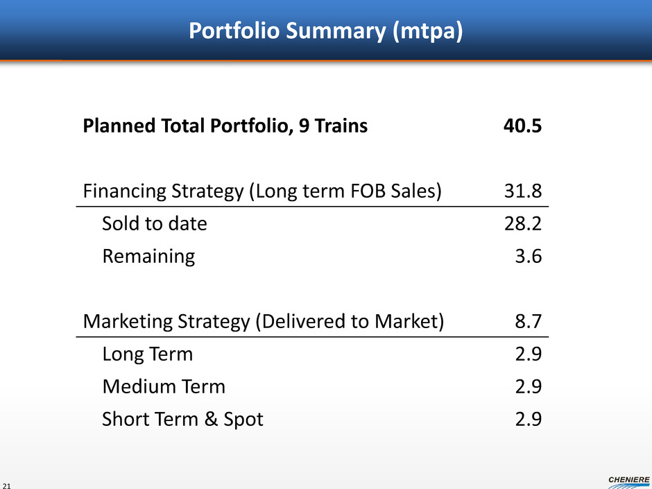 Portfolio Summary (mtpa) 21 Planned Total Portfolio, 9 Trains 40.5 Financing Strategy (Long term FOB Sales) 31.8 Sold to date 28.2 Remaining 3.6 Marketing Strategy (Delivered to Market) 8.7 Long Term 2.9 Medium Term 2.9 Short Term & Spot 2.9