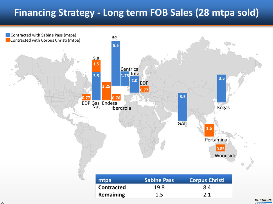 Financing Strategy - Long term FOB Sales (28 mtpa sold) 22 383 1.5 2.25 0.76 0.85 0.77 0.77 BG GAIL Kogas Total Centrica Pertamina Endesa Iberdrola Woodside EDF EDP 5.5 3.5 3.5 2.0 1.75 Contracted with Sabine Pass (mtpa) Contracted with Corpus Christi (mtpa) Gas Nat 1.5 3.5 5.0 mtpa Sabine Pass Corpus Christi Contracted 19.8 8.4 Remaining 1.5 2.1
