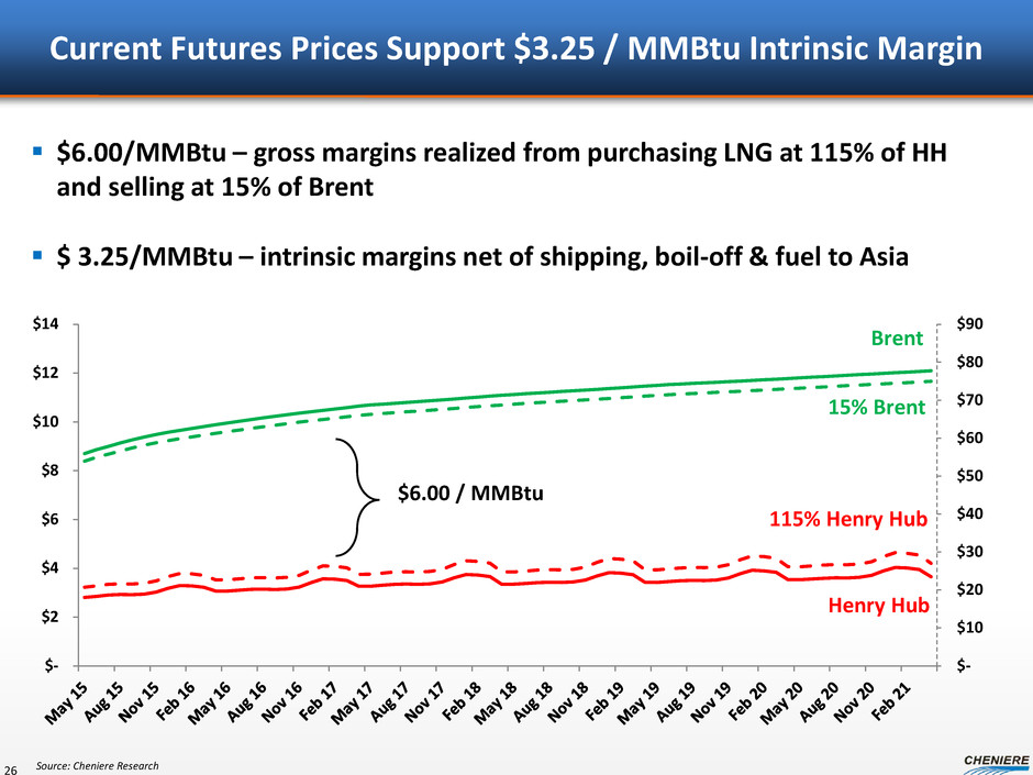 Cheniere Marketing: Building a Portfolio Up to 9 mtpa to be delivered to market plus additional positions & assets 23 Call options at Henry Hub Index to begin in 2016 Put options at Isle of Grain until 2022 5 year time charters on 3 LNG vessels to begin in 2015 and 2016 Regas assets in Chile FID pending Sales agreements for ~150 million MMBtu 2016 – 2018 delivery