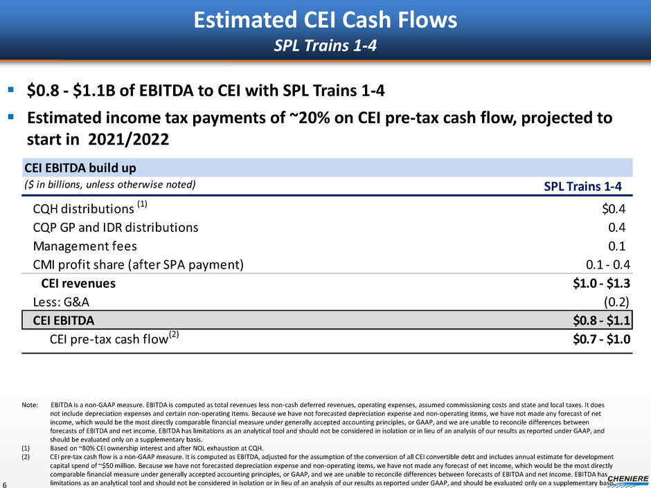 CEI EBITDA build up ($ in billions, except per unit amounts or unless otherwise noted) + Add. 2-train expansion SPL T1-6, CCL T1-3, Add. 2-train exp. CQH distributions(1) – $0.6 CQP GP and IDR distributions – 0.8 Management fees +0.0 0.1 CMI profit (after SPA payment) +0.1 - 0.4 0.6 - 2.2 CCL Trains 1-3 EBITDA – 2.0 Additional 2-train expansion EBITDA +1.3 1.3 CEI revenues +1.5 - 1.8 $5.4 - $7.1 Less: G&A – (0.2) CEI EBITDA +1.5 - 1.8 $5.2 - $6.9 Less: CCL project-level interest expense(2) – (0.7) Less: 2-train expansion project-level interest expense(2) (0.5) (0.5) CEI pre-tax cash flow(3) +1.0 - 1.3 $3.9 - $5.6 Estimated CEI Cash Flows SPL Trains 1-6, CCL Trains 1-3, Additional 2-train expansion 20 $5.2 - $6.9 billion of EBITDA to CEI with SPL Trains 1-6, CCL Trains 1-3 and additional 2-train expansion Estimated income tax payments of ~20% on CEI pre-tax cash flow, projected to start in 2020/2021 Note: EBITDA is a non-GAAP measure. EBITDA is computed as total revenues less non-cash deferred revenues, operating expenses, assumed commissioning costs and state and local taxes. It does not include depreciation expenses and certain non-operating items. Because we have not forecasted depreciation expense and non-operating items, we have not made any forecast of net income, which would be the most directly comparable financial measure under generally accepted accounting principles, or GAAP, and we are unable to reconcile differences between forecasts of EBITDA and net income. EBITDA has limitations as an analytical tool and should not be considered in isolation or in lieu of an analysis of our results as reported under GAAP, and should be evaluated only on a supplementary basis. (1) Based on ~80% CEI ownership interest and after NOL exhaustion at CQH. (2) Assumes CCL project-level debt of ~$11.5 billion at 6.0% annual interest rate. Assumes 2-train expansion project-level debt of ~$7.5 billion at 6.0% annual interest rate. (3) CEI pre-tax cash flow is a non-GAAP measure. It is computed as EBITDA, adjusted for the assumption of the conversion of all CEI and CCH convertible debt and includes annual estimate for development capital spend of ~$50 million. Because we have not forecasted depreciation expense and non-operating items, we have not made any forecast of net income, which would be the most directly comparable financial measure under generally accepted accounting principles, or GAAP, and we are unable to reconcile differences between forecasts of EBITDA and net income. EBITDA has limitations as an analytical tool and should not be considered in isolation or in lieu of an analysis of our results as reported under GAAP, and should be evaluated only on a supplementary basis.