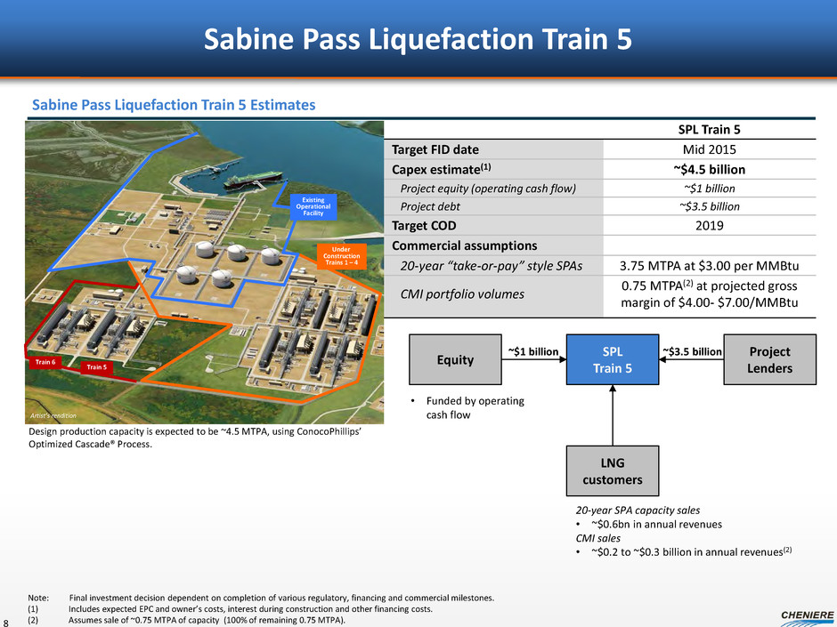 Corpus Christi Liquefaction Trains 1-2 7 Corpus Christi Liquefaction Trains 1-2 Estimates Design production capacity is expected to be ~4.5 MTPA per train, using ConocoPhillips’ Optimized Cascade® Process. CEI CCH / CCL (Trains 1-2) LNG Customers Project Lenders ~$8.4 billion funded during construction CCL Trains 1-2 Target FID date Q2 2015 Capex estimate(1) ~$11.4 billion Project equity (EIG, CEI equity contribution and operating cash flow) ~$3.0 billion Project debt ~$8.4 billion Target COD 2019 / 2020 Commercial assumptions 20-year “take-or-pay” style SPAs 7.65 MTPA at $3.50 per MMBtu CMI portfolio volumes ~1.4 MTPA(2) at projected gross margin of $4.00 -$7.00 per MMBtu Note: CCH and CCH HoldCo entity detail not fully shown in diagram. Equity funding from project operating cash flow and development equity not shown in diagram. FID dependent on completion of various regulatory and financing milestones. (1) Includes EPC and owner’s costs, interest during construction and other financing costs. (2) Assumes sale of ~1.4 MTPA of capacity (100% of remaining 1.4 MTPA). (3) EIG investment to be funded at the CCH HoldCo II entity. 20-year SPA capacity sales • ~$1.4 billion in annual revenues CMI sales • ~$0.3 to ~$0.5 billion in annual revenues(2) • ~$0.5 billion funded upfront • ~$1.1 billion funded during construction (2017-2018) Houston New Orleans Gulf of Mexico Corpus Christi Artist’s rendition CCH HoldCo II EIG(3) $1.0 billion funded upfront