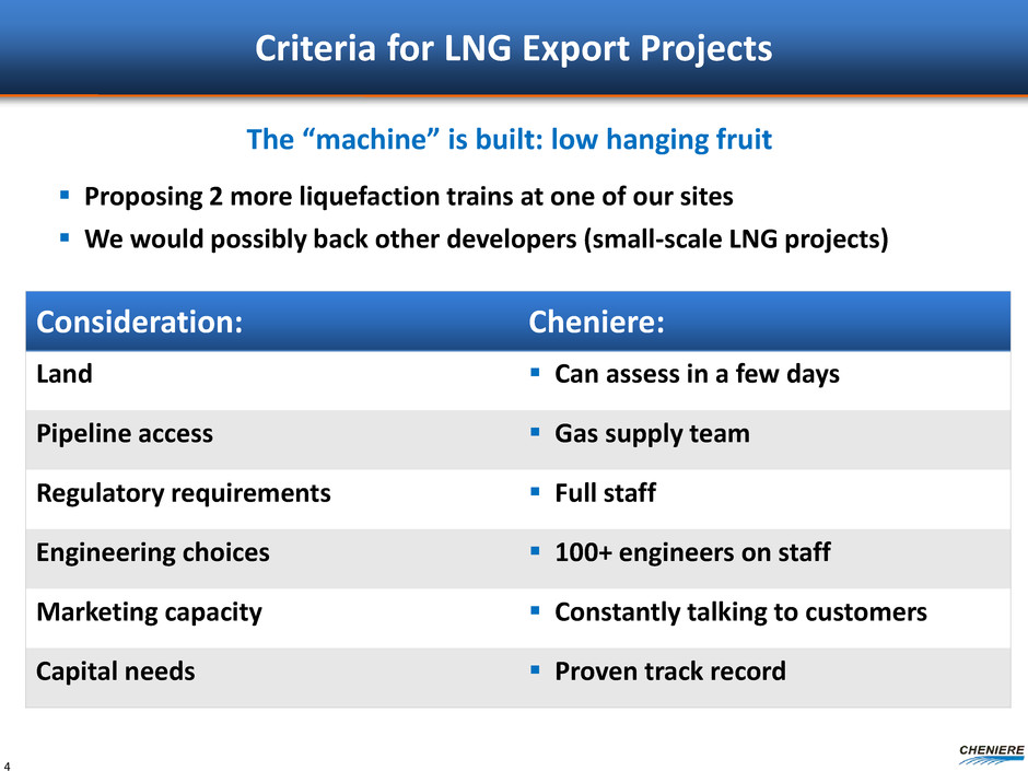 $9.5 $12.0 $14.0 $14.5 $13.0$11.5 $13.0 $16.0 $17.0 $18.5 $5 $10 $15 $20 Cheniere Gulf Coast West Africa Western Canada Northwest Australia East Africa Southeast Asia LN G p ri ce s ($ /M M B tu ) Cheniere Provides a Low Cost and Flexible Incremental LNG Supply Source At $4.00/MMBtu Henry Hub, Cheniere is the low cost source of new LNG supply Cheniere LNG has destination flexibility and does not require lifting Cheniere has a proven development track record and differentiates itself by offering upstream gas procurement services 3 LNG supply curve (Estimated breakeven LNG pricing range, Delivered Ex-Ship to Asia) Source: Cheniere Research, Wood Mackenzie, company filings and investor materials. Note: Breakeven prices derived assuming unlevered after-tax returns of 10% on Canadian projects and 12% on all other projects over construction plus 20 years of operation.