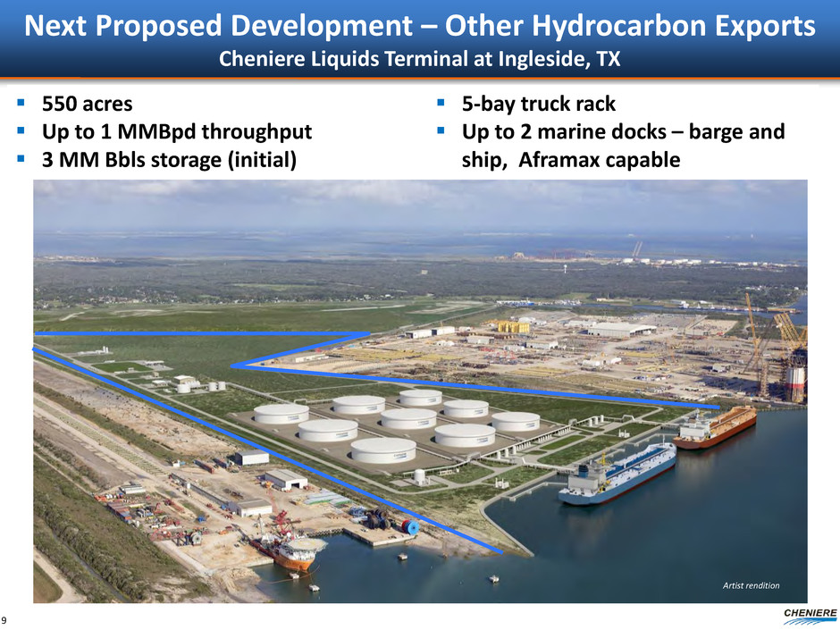 9 Next Proposed Development – Other Hydrocarbon Exports Cheniere Liquids Terminal at Ingleside, TX 550 acres Up to 1 MMBpd throughput 3 MM Bbls storage (initial) 5-bay truck rack Up to 2 marine docks – barge and ship, Aframax capable Artist rendition