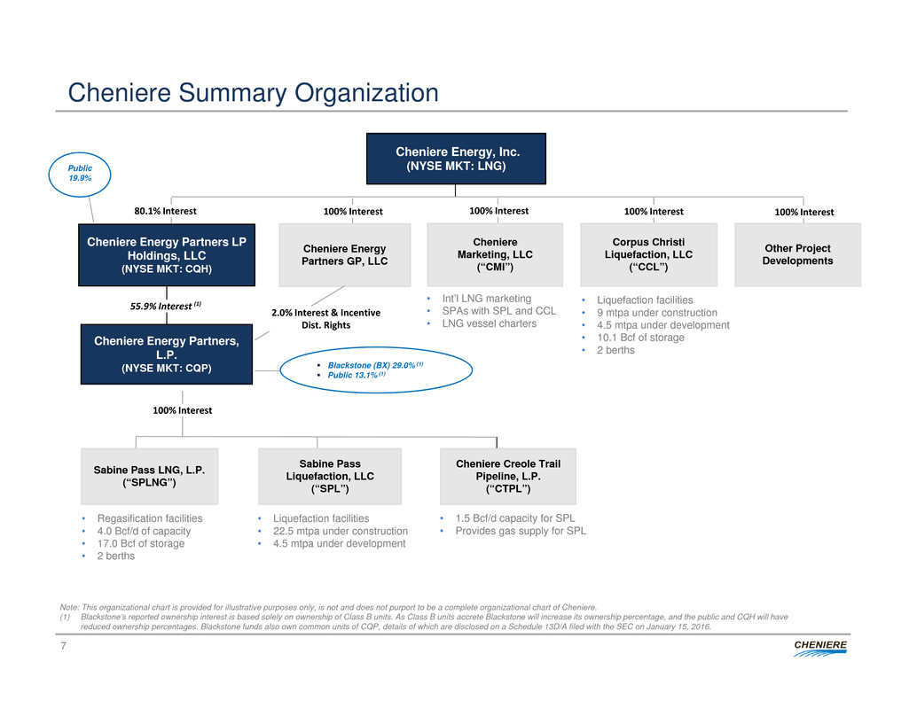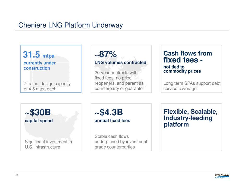 Forward Looking Statements This presentation contains certain statements that are, or may be deemed to be, “forward-looking statements” within the meaning of Section 27A of the Securities Act of 1933, as amended, and Section 21E of the Securities Exchange Act of 1934, as amended. All statements, other than statements of historical facts, included or incorporated by reference herein are “forward-looking statements.” Included among “forward- looking statements” are, among other things: statements regarding the ability of Cheniere Energy Partners, L.P. to pay distributions to its unitholders or Cheniere Energy Partners LP Holdings, LLC to pay dividends to its shareholders; statements regarding Cheniere Energy Inc.’s, Cheniere Energy Partners LP Holdings, LLC’s or Cheniere Energy Partners, L.P.’s expected receipt of cash distributions from their respective subsidiaries; statements that Cheniere Energy Partners, L.P. expects to commence or complete construction of its proposed liquefied natural gas (“LNG”) terminals, liquefaction facilities, pipeline facilities or other projects, or any expansions thereof, by certain dates or at all; statements that Cheniere Energy, Inc. expects to commence or complete construction of its proposed LNG terminals, liquefaction facilities, pipeline facilities or other projects by certain dates or at all; statements regarding future levels of domestic and international natural gas production, supply or consumption or future levels of LNG imports into or exports from North America and other countries worldwide, or purchases of natural gas, regardless of the source of such information, or the transportation or other infrastructure, or demand for and prices related to natural gas, LNG or other hydrocarbon products; statements regarding any financing transactions or arrangements, or ability to enter into such transactions; statements relating to the construction of our proposed liquefaction facilities and natural gas liquefaction trains (“Trains”) and the construction of the Corpus Christi Pipeline, including statements concerning the engagement of any engineering, procurement and construction ("EPC") contractor or other contractor and the anticipated terms and provisions of any agreement with any EPC or other contractor, and anticipated costs related thereto; statements regarding any agreement to be entered into or performed substantially in the future, including any revenues anticipated to be received and the anticipated timing thereof, and statements regarding the amounts of total LNG regasification, liquefaction or storage capacities that are, or may become, subject to contracts; statements regarding counterparties to our commercial contracts, construction contracts and other contracts; statements regarding our planned development and construction of additional Trains, including the financing of such Trains; statements that our Trains, when completed, will have certain characteristics, including amounts of liquefaction capacities; statements regarding our business strategy, our strengths, our business and operation plans or any other plans, forecasts, projections or objectives, including anticipated revenues, capital expenditures, maintenance and operating costs, EBITDA, project EBITDA, project level deconsolidated EBITDA, project cash flow, distributable cash flow, deconsolidated cash flow, pre-tax cash flow and pre-tax cash flow per share, any or all of which are subject to change; statements regarding projections of revenues, expenses, earnings or losses, working capital or other financial items; statements regarding legislative, governmental, regulatory, administrative or other public body actions, approvals, requirements, permits, applications, filings, investigations, proceedings or decisions; statements regarding our anticipated LNG and natural gas marketing activities; and any other statements that relate to non-historical or future information. These forward-looking statements are often identified by the use of terms and phrases such as “achieve,” “anticipate,” “believe,” “contemplate,” “develop,” “estimate,” “example,” “expect,” “forecast,” “goals,” “opportunities,” “plan,” “potential,” “project,” “propose,” “subject to,” “strategy,” “target,” and similar terms and phrases, or by use of future tense. Although we believe that the expectations reflected in these forward- looking statements are reasonable, they do involve assumptions, risks and uncertainties, and these expectations may prove to be incorrect. You should not place undue reliance on these forward-looking statements, which speak only as of the date of this presentation. Our actual results could differ materially from those anticipated in these forward-looking statements as a result of a variety of factors, including those discussed in “Risk Factors” in the Cheniere Energy, Inc., Cheniere Energy Partners, L.P. and Cheniere Energy Partners LP Holdings, LLC Annual Reports on Form 10-K filed with the SEC on February 19, 2016, which are incorporated by reference into this presentation. All forward-looking statements attributable to us or persons acting on our behalf are expressly qualified in their entirety by these ”Risk Factors.” These forward-looking statements are made as of the date of this presentation, and other than as required under the securities laws, we undertake no obligation to publicly update or revise any forward-looking statements. 2