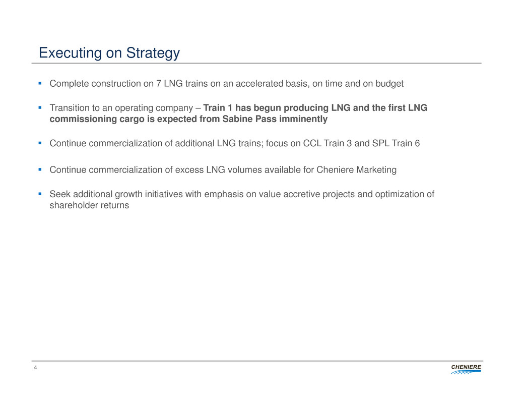 Executing on Strategy 4 Complete construction on 7 LNG trains on an accelerated basis, on time and on budget Transition to an operating company – Train 1 has begun producing LNG and the first LNG commissioning cargo is expected from Sabine Pass imminently Continue commercialization of additional LNG trains; focus on CCL Train 3 and SPL Train 6 Continue commercialization of excess LNG volumes available for Cheniere Marketing Seek additional growth initiatives with emphasis on value accretive projects and optimization of shareholder returns
