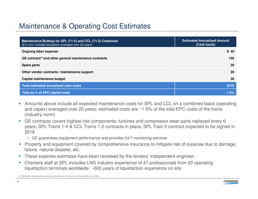 Cheniere Projected Cash Flow Build-Up With 7 Trains Estimates based on fixed fees underpinned by 20-year “take-or-pay” style SPAs representing ~87% of design production capacity for seven Trains For inclusion of CMI sales, remaining capacity estimated to be sold based on estimated market spreads 5 * Represents expected cash flows from ownership in CQP and CQH, net of interest expense Note: See “Forward Looking Statements” Slide. For supplementary financial details, see slide 29. Cash flow build up scenario above assumes refinancing of SPL and CCH credit facilities with non-amortizing project bonds and remaining equity requirements funded by operating cash flow and cash on hand. Scenario which includes CMI sales assumes market spreads of $2.50. EBITDA, project EBITDA, pre-tax cash flow and pre-tax cash flow per share are non-GAAP measures. EBITDA is computed as earnings before interest, taxes, depreciation and amortization. We have not made any forecast of net income, which would be the most comparable financial measure under GAAP, and we are unable to reconcile differences between these forecasted non-GAAP measures and net income. Non-GAAP measures have limitations as an analytical tool and should not be considered in isolation or in lieu of an analysis of our results as reported under GAAP, and should be evaluated only on a supplementary basis. (1) Assumes ~277 million CEI shares outstanding – assumes conversion of $1.0 billion PIK Convertible Notes due 2021 and $1.0 billion Senior Secured Convertible Notes due 2025 at $93.64/share. ($ in billions, except per share amounts) CQP (SPL T1-5/ SPLNG/CTPL) CCL CCL T1-2 CEI Standalone Project EBITDA to CEI (net of minority interests) $1.0* $1.3 $2.3 Plus: Management fees to CEI 0.1 Less: CEI G&A (0.3) CEI Standalone EBITDA $2.1 Less: CCL project interest expense (0.5) Less: CEI-level interest expense (0.0) Pre-tax CEI cash flow $1.6 Pre-tax CEI cash flow per share $5.80(1) Pre-tax CEI cash flow per share (no CMI sales) $4.20(1)
