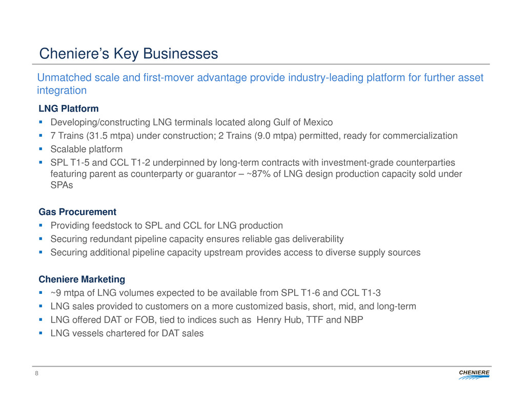 Cheniere Summary Organization 7 Cheniere Energy, Inc. (NYSE MKT: LNG) Sabine Pass LNG, L.P. (“SPLNG”) Sabine Pass Liquefaction, LLC (“SPL”) Cheniere Energy Partners, L.P. (NYSE MKT: CQP) Cheniere Creole Trail Pipeline, L.P. (“CTPL”) Corpus Christi Liquefaction, LLC (“CCL”) Cheniere Marketing, LLC (“CMI”) Cheniere Energy Partners GP, LLC 100% Interest 100% Interest 100% Interest100% Interest Note: This organizational chart is provided for illustrative purposes only, is not and does not purport to be a complete organizational chart of Cheniere. (1) Blackstone’s reported ownership interest is based solely on ownership of Class B units. As Class B units accrete Blackstone will increase its ownership percentage, and the public and CQH will have reduced ownership percentages. Blackstone funds also own common units of CQP, details of which are disclosed on a Schedule 13D/A filed with the SEC on January 15, 2016. • Liquefaction facilities • 9 mtpa under construction • 4.5 mtpa under development • 10.1 Bcf of storage • 2 berths • Regasification facilities • 4.0 Bcf/d of capacity • 17.0 Bcf of storage • 2 berths • Liquefaction facilities • 22.5 mtpa under construction • 4.5 mtpa under development Cheniere Energy Partners LP Holdings, LLC (NYSE MKT: CQH) • 1.5 Bcf/d capacity for SPL • Provides gas supply for SPL 80.1% Interest 55.9% Interest (1) 2.0% Interest & Incentive Dist. Rights • Int’l LNG marketing • SPAs with SPL and CCL • LNG vessel charters Other Project Developments 100% Interest Blackstone (BX) 29.0% (1) Public 13.1% (1) Public 19.9%