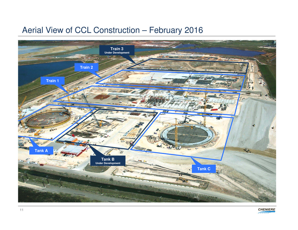 Aerial View of SPL Construction – February 2016 10 Train 1 Train 3 Train 4 Train 2 Train 5 Train 6 Under Development T1-2 Gas Meter T3-4 Gas Meter Propane Condenser Area Air CoolersT1 Methane Cold Box T1 Ethylene Cold Box
