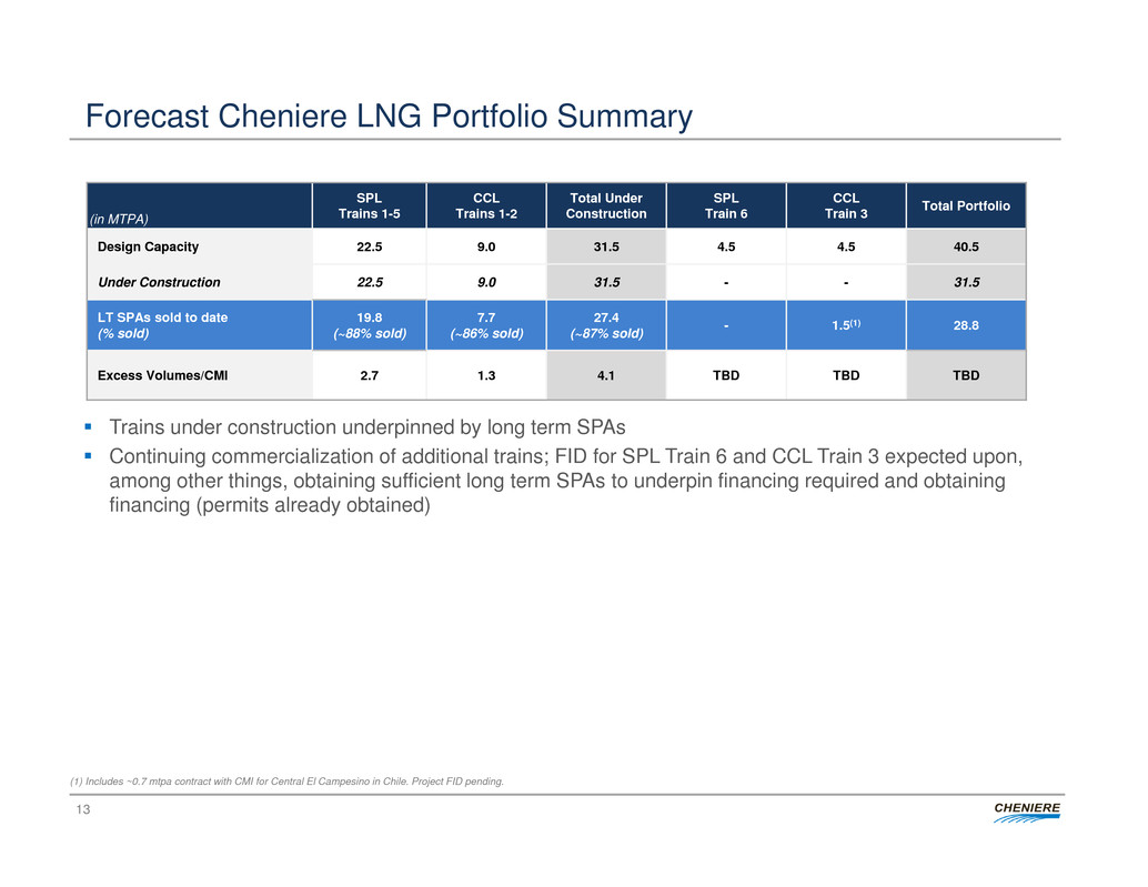 Cheniere LNG Projects: Attractive Features Cheniere LNG SPAs: LNG price tied to Henry Hub, offer destination flexibility, upstream gas procurement services included, no lifting requirements SPAs with investment grade off-takers featuring parent as counterparty or guarantor; HH + fixed fee pricing; no price reopeners, portion of fixed fee to escalate with inflation over time as described in each SPA EPC contractor: proven track record of execution; proven liquefaction technology 12 PT Pertamina (Persero) Endesa S.A. Iberdrola S.A. Gas Natural Fenosa Woodside Energy Trading Électricité de France EDP Energias de Portugal S.A. BG Gulf Coast LNG Gas Natural Fenosa GAIL (India) LimitedKorea Gas Corporation Total Gas & Power N.A. Centrica plc Corpus Christi Customers Sabine Pass Customers