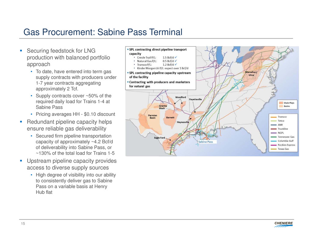 Estimated EBITDA forecast for CEI standalone based on addition of Train 8 (Corpus Christi Train 3) and Train 9 (Sabine Pass Train 6) 14 * Represents expected cash flows from ownership in CQP and CQH, net of interest expense. Note: See “Forward Looking Statements” Slide. For supplementary financial details, see slide 29 Cash flow build up scenario above assumes refinancing of SPL and CCH credit facilities with non-amortizing project bonds and remaining equity requirements funded by operating cash flow and cash on hand. Scenario assumes full utilization of capacity available and excess volumes sold by CMI at market spreads of $2.50. 8 train case assumes additional ~2.1MTPA of 20-year SPAs at $3.50/mmbtu on CCL Train 3; 9 train case assumes 1.5MTPA of 20-year SPAs at $3.50/mmbtu on SPL Train 6. EBITDA is a non-GAAP measure. EBITDA is computed as earnings before interest, taxes, depreciation and amortization. We have not made any forecast of net income, which would be the most comparable financial measure under GAAP, and we are unable to reconcile differences between forecasted EBITDA and net income. Non-GAAP measures have limitations as an analytical tool and should not be considered in isolation or in lieu of an analysis of our results as reported under GAAP, and should be evaluated only on a supplementary basis. Run-rate scenarios 7 trains 8 trains 9 trains SPL T1-5/6 and SPLNG/CTPL via GP/IDR and CQH $1.0* $1.0* $1.3* Management fees $0.1 $0.1 $0.1 CCL T1-2/3 $1.3 $2.0 $2.0 CMI profit share - - - Total $2.4 $3.1 $3.3 Less CEI G&A ($0.3) ($0.3) ($0.3) CEI Standalone EBITDA $2.1 $2.8 $3.0 Illustrative cash flow build-up ($ in billions) CEI Standalone EBITDA Forecast with Additional Trains