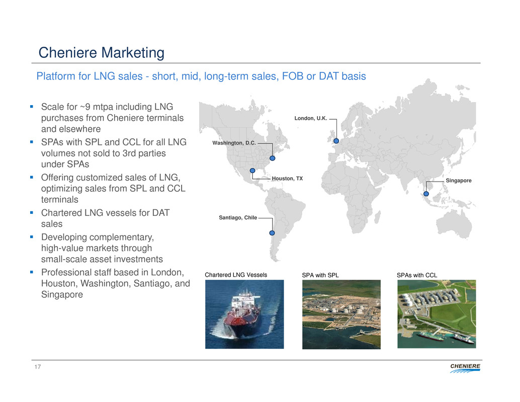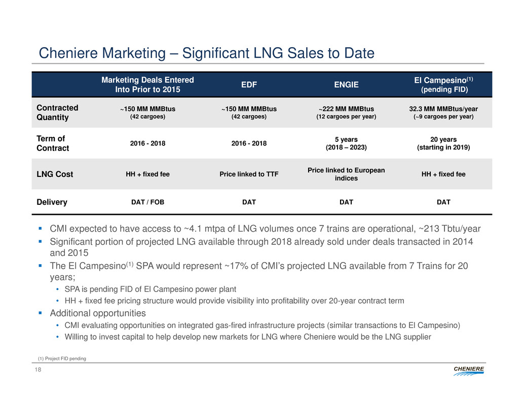 Cheniere Marketing Scale for ~9 mtpa including LNG purchases from Cheniere terminals and elsewhere SPAs with SPL and CCL for all LNG volumes not sold to 3rd parties under SPAs Offering customized sales of LNG, optimizing sales from SPL and CCL terminals Chartered LNG vessels for DAT sales Developing complementary, high-value markets through small-scale asset investments Professional staff based in London, Houston, Washington, Santiago, and Singapore 17 SingaporeHouston, TX Santiago, Chile London, U.K. Washington, D.C. Chartered LNG Vessels SPA with SPL SPAs with CCL Platform for LNG sales - short, mid, long-term sales, FOB or DAT basis