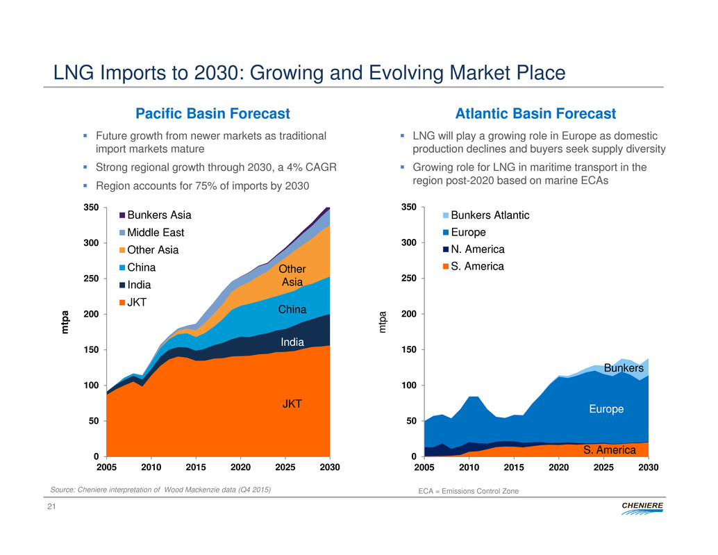 0 100 200 300 400 500 2000 2005 2010 2015 2020 2025 2030 m t p a U.S. to Become Third Largest LNG Supplier LNG demand expected to nearly double from 2015 to 2030 Supply-demand gap projected to open shortly after 2020 as trade grows and existing production declines in certain regions ~42 LNG trains(1) need to take FID by 2025 to meet forecasted demand through 2030 20 Sources: Cheniere interpretation of Wood Mackenzie data (Q4 2015) Qatar LNG trade forecasts Australia New supply ~180 mtpa Supply: existing and under construction USA 2015 to 2030 CAGR = 4.8% (1) Assuming 85% utilization of nameplate capacity ~211 mtpa of new liquefaction capacity would be required. 5 mtpa trains = 42 trains.