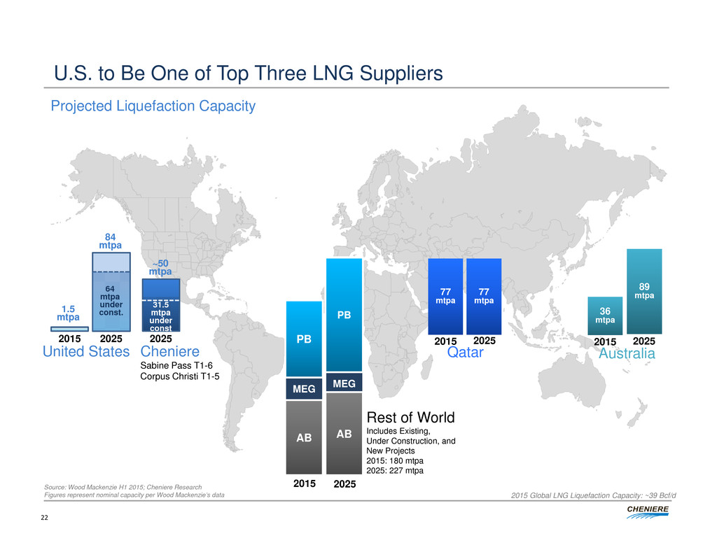 LNG Imports to 2030: Growing and Evolving Market Place 0 50 100 150 200 250 300 350 2005 2010 2015 2020 2025 2030 Bunkers Atlantic Europe N. America S. America 21 0 50 100 150 200 250 300 350 2005 2010 2015 2020 2025 2030 Bunkers Asia Middle East Other Asia China India JKT m t p a JKT China India Other Asia S. America Pacific Basin Forecast Atlantic Basin Forecast Source: Cheniere interpretation of Wood Mackenzie data (Q4 2015) Europe Bunkers Future growth from newer markets as traditional import markets mature Strong regional growth through 2030, a 4% CAGR Region accounts for 75% of imports by 2030 m t p a LNG will play a growing role in Europe as domestic production declines and buyers seek supply diversity Growing role for LNG in maritime transport in the region post-2020 based on marine ECAs ECA = Emissions Control Zone