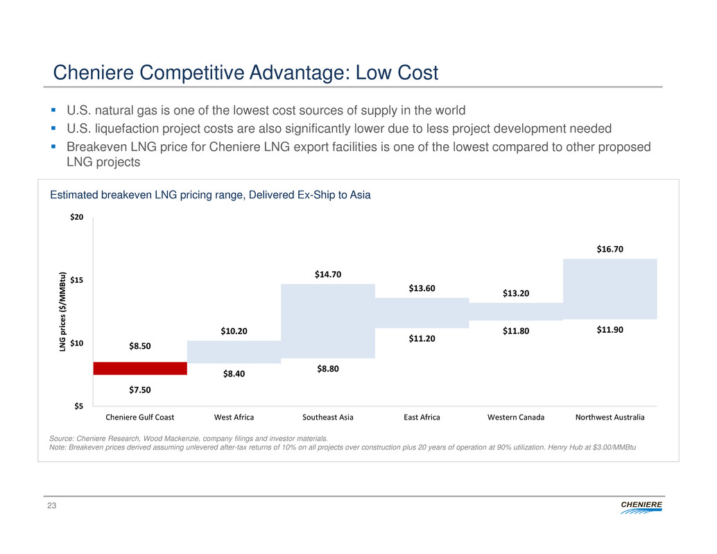 2015 Global LNG Liquefaction Capacity: ~39 Bcf/d 22 United States 77 mtpa 77 mtpa Qatar Source: Wood Mackenzie H1 2015; Cheniere Research Figures represent nominal capacity per Wood Mackenzie’s data 2015 2025 2015 2025 2015 2025 MEG MEG Rest of World Includes Existing, Under Construction, and New Projects 2015: 180 mtpa 2025: 227 mtpa AB 2015 2025 AB PB PB 1.5 mtpa 36mtpa 89 mtpa AustraliaCheniere Sabine Pass T1-6 Corpus Christi T1-5 2025 64 mtpa under const. 31.5 mtpa under const . 84 mtpa ~50 mtpa U.S. to Be One of Top Three LNG Suppliers Projected Liquefaction Capacity