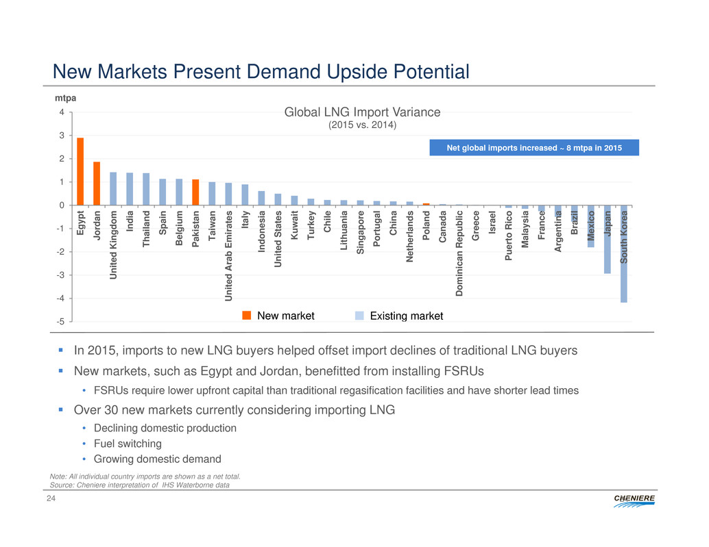 23 U.S. natural gas is one of the lowest cost sources of supply in the world U.S. liquefaction project costs are also significantly lower due to less project development needed Breakeven LNG price for Cheniere LNG export facilities is one of the lowest compared to other proposed LNG projects Cheniere Competitive Advantage: Low Cost Estimated breakeven LNG pricing range, Delivered Ex-Ship to Asia Source: Cheniere Research, Wood Mackenzie, company filings and investor materials. Note: Breakeven prices derived assuming unlevered after-tax returns of 10% on all projects over construction plus 20 years of operation at 90% utilization. Henry Hub at $3.00/MMBtu $7.50 $8.40 $8.80 $11.20 $11.80 $11.90 $8.50 $10.20 $14.70 $13.60 $13.20 $16.70 $5 $10 $15 $20 Cheniere Gulf Coast West Africa Southeast Asia East Africa Western Canada Northwest Australia L N G p r i c e s ( $ / M M B t u )