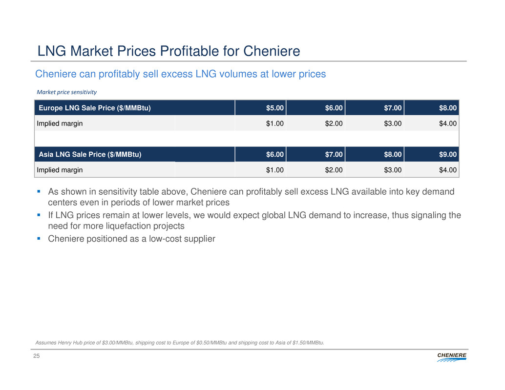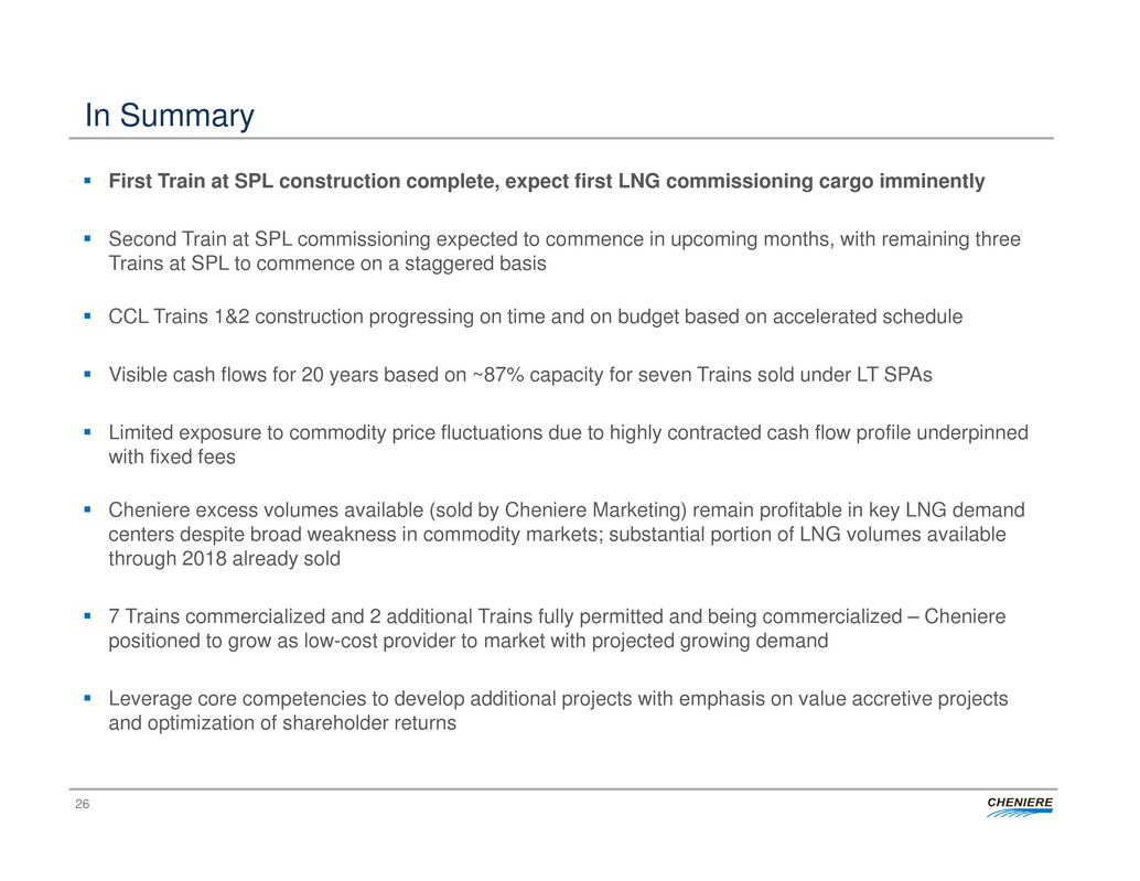 LNG Market Prices Profitable for Cheniere As shown in sensitivity table above, Cheniere can profitably sell excess LNG available into key demand centers even in periods of lower market prices If LNG prices remain at lower levels, we would expect global LNG demand to increase, thus signaling the need for more liquefaction projects Cheniere positioned as a low-cost supplier 25 Cheniere can profitably sell excess LNG volumes at lower prices Market price sensitivity Europe LNG Sale Price ($/MMBtu) $5.00 $6.00 $7.00 $8.00 Implied margin $1.00 $2.00 $3.00 $4.00 Asia LNG Sale Price ($/MMBtu) $6.00 $7.00 $8.00 $9.00 Implied margin $1.00 $2.00 $3.00 $4.00 Assumes Henry Hub price of $3.00/MMBtu, shipping cost to Europe of $0.50/MMBtu and shipping cost to Asia of $1.50/MMBtu.