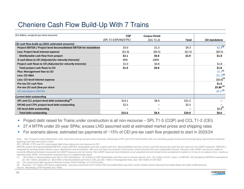 Cheniere’s Debt Summary – February 2016 28 Cheniere Energy, Inc. (NYSE MKT: LNG) Cheniere Energy Partners, L.P. (NYSE MKT: CQP) Sabine Pass LNG, L.P. (SPLNG) Total TUA (1 Bcf/d) Chevron TUA (1 Bcf/d) SPL TUA (2 Bcf/d) Sr Secured Notes $1,666 due 2016 (7.50%) $420 due 2020 (6.50%) ($ in millions) Cheniere Marketing, LLC (CMI) Trains 1-5 Debt $4,600 Credit Facilities due 20201 $2,000 Notes due 2021 (5.625%) $1,000 Notes due 2022 (6.250%) $1,500 Notes due 2023 (5.625%) $2,000 Notes due 2024 (5.750%) $2,000 Notes due 2025 (5.625%) $1,200 Working Capital Facility due 20202 Sabine Pass Liquefaction, LLC (SPL) Creole Trail Pipeline (CTPL) $400 Term Loan due 2017 (L+325) CQP GP (& IDRs) (1) Includes $2,850 million term loan facility, $1,150 million Republic of Korea (“ROK”) covered facility and $600 million ROK direct facility. Interest on the term loan facility is L+175 bps during construction and operation. Under the ROK credit facilities, interest includes L+175 on the direct portion and L+130 on the covered portion during construction and operation. In addition, SPL will pay 45 bps for insurance/guarantee premiums on any drawn amounts under the covered tranches. These credit facilities mature on the earlier of December 31, 2020 or the second anniversary of Train 5 completion date. (2) Interest on the working capital facility is L+175. (3) Interest on the term loan facility is L+225 bps during construction and L+250 bps during operation. This credit facility matures on the earlier of May 13, 2022 or the second anniversary of project completion date . Note: This organizational chart is provided for illustrative purposes only, is not and does not purport to be a complete organizational chart of Cheniere. Cheniere Energy Partners LP Holdings, LLC (NYSE MKT: CQH) Cheniere CCH Holdco II, LLC Convertible Debt $1,000 PIK Convertible Notes due 2021 (4.875%) $625 Convertible Notes due 2045 (4.250%) SPL Firm Transport (1.5 Bcf/d) BG SPA (286.5 Tbtu / yr) Gas Natural SPA (182.5 Tbtu / yr) KOGAS SPA (182.5 Tbtu / yr) GAIL (182.5 Tbtu / yr) Total (104.8 Tbtu / yr) Centrica (91.3 Tbtu / yr) CMI SPA Pertamina SPA (79.4 Tbtu / yr) Endesa SPA (117.3 Tbtu / yr) Iberdrola SPA (39.7 Tbtu / yr) Gas Natural (78.2 Tbtu / yr) Woodside (44.1 Tbtu / yr) EDF (40.0 Tbtu / yr) EDP (40.0 Tbtu / yr) CMI SPA Cheniere Corpus Christi Holdings, LLC (CCH) Trains 1-2 Equity $1,000 Senior Secured Convertible Notes due 2025 Trains 1-2 Debt ~$8,400 Credit Facility due 20223 Corpus Christi Liquefaction, LLC (CCL) On January 25, 2016, CQP announced a committed bank facility of $2.8 billion, which will be used to refinance the debt at SPLNG and CTPL. The facility is expected to close during 1Q16.