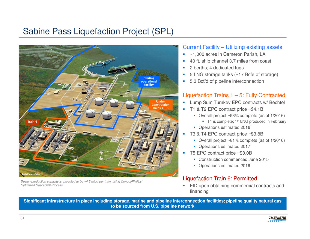 Conversion - Class B and Subordinated Units Class B Units: Mandatory conversion: within 90 days of the substantial completion of Train 3 Optional conversion by a Class B unitholder may occur at any of the following times: After 83 months from issuance of EPC notice to proceed Prior to the record date for a quarter in which sufficient cash from operating surplus is generated to distribute $0.425 to all outstanding common units and the common units to be issued upon conversion Thirty (30) days prior to the mandatory conversion date Within a 30-day period prior to a significant event or a dissolution Subordinated Units: Subordinated units will convert into common units on a one-for-one basis, provided that there are no cumulative common unit arrearages, and either of the below distribution hurdles is met: For three consecutive, non-overlapping four-quarter periods, the distribution paid from “Adjusted Operating Surplus”(1) to all outstanding units(2) equals or exceeds $0.425 per quarter For four consecutive quarters, the distribution paid from “Contracted Adjusted Operating Surplus”(1) to all outstanding units(2) equals or exceeds $0.638 per quarter 30 (1) As defined in CQP’s partnership agreement. (2) Includes all outstanding common units (assuming conversion of all Class B units), subordinated units and any other outstanding units that are senior or equal in right of distribution to the subordinated units.