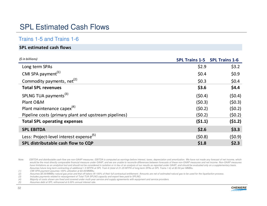 SPL Estimated Cash Flows 32 Note: EBITDA and distributable cash flow are non-GAAP measures. EBITDA is computed as earnings before interest, taxes, depreciation and amortization. We have not made any forecast of net income, which would be the most directly comparable financial measure under GAAP, and we are unable to reconcile differences between forecasts of these non-GAAP measures and net income. Non-GAAP measures have limitations as an analytical tool and should not be considered in isolation or in lieu of an analysis of our results as reported under GAAP, and should be evaluated only on a supplementary basis. Assumes future long term contracting of additional 1.5 MTPA at SPL Train 6 (total of 21.25 MTPA of long term SPAs at SPL Trains 1-6) at $3.50 per MMBtu. (1) CMI SPA payment assumes 100% utilization at $3.00/MMBtu. (2) Assumes $5.00/MMBtu natural gas price and that off-takers lift 100% of their full contractual entitlement. Amounts are net of estimated natural gas to be used for the liquefaction process. (3) Includes payments related to reassignment of Total TUA SPLNG capacity and export fees paid to SPLNG. (4) Majority of costs shown are fixed and covered under multi-year service and supply agreements with equipment and service providers. (5) Assumes debt at SPL refinanced at 6.00% annual interest rate. SPL estimated cash flows ($ in billions) SPL Trains 1‐5 SPL Trains 1‐6 Long term SPAs $2.9 $3.2 CMI SPA payment(1) $0.4 $0.9 Commodity payments, net(2) $0.3 $0.4 Total SPL revenues $3.6 $4.4 SPLNG TUA payments(3) ($0.4) ($0.4) Plant O&M ($0.3) ($0.3) Plant maintenance capex(4) ($0.2) ($0.2) Pipeline costs (primary plant and upstream pipelines) ($0.2) ($0.2) Total SPL operating expenses ($1.1) ($1.2) SPL EBITDA $2.6 $3.3 Less: Project‐level interest expense(5) ($0.8) ($0.9) SPL distributable cash flow to CQP $1.8 $2.3 Trains 1-5 and Trains 1-6