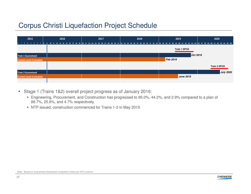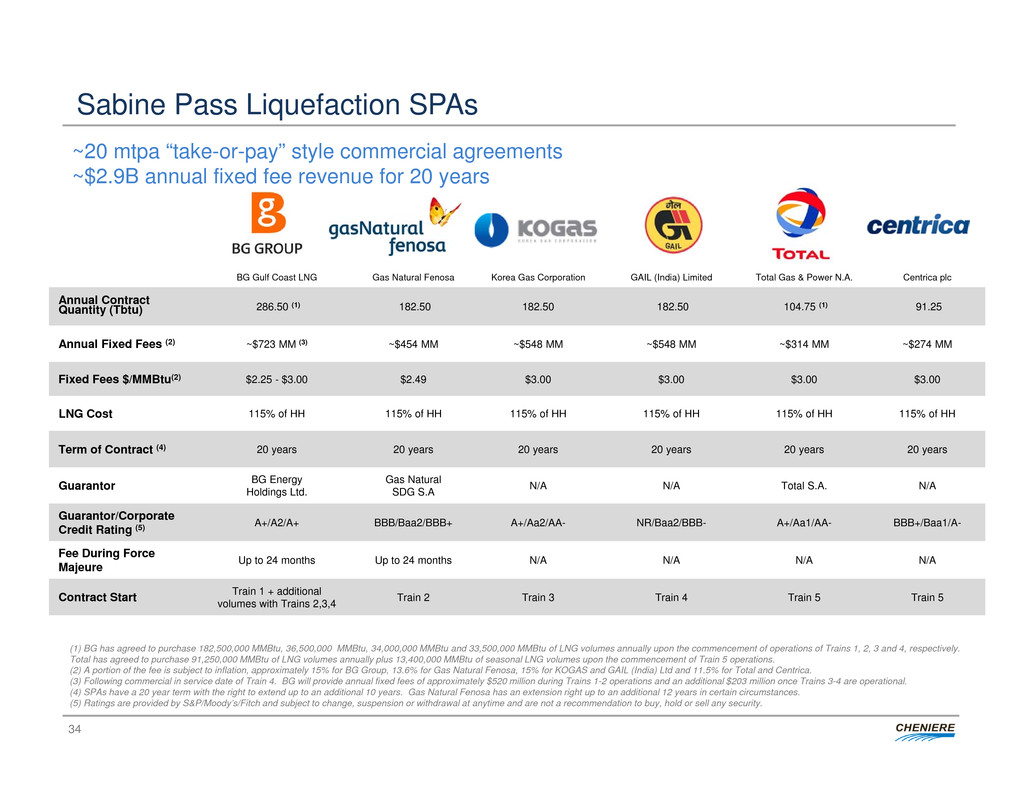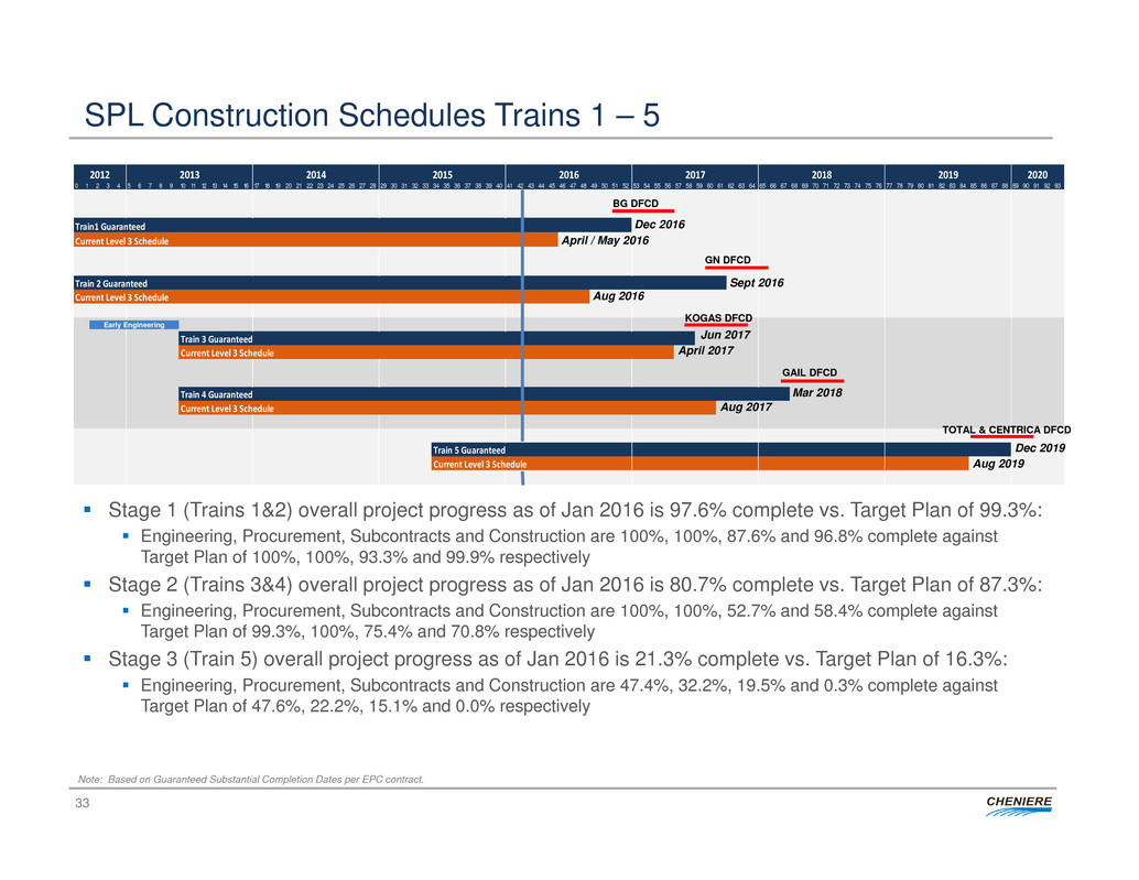 0 1 2 3 4 5 6 7 8 9 10 11 12 13 14 15 16 17 18 19 20 21 22 23 24 25 26 27 28 29 30 31 32 33 34 35 36 37 38 39 40 41 42 43 44 45 46 47 48 49 50 51 52 53 54 55 56 57 58 59 60 61 62 63 64 65 66 67 68 69 70 71 72 73 74 75 76 77 78 79 80 81 82 83 84 85 86 87 88 89 90 91 92 93 Train1 Guaranteed Current Level 3 Schedule Train 2 Guaranteed Current Level 3 Schedule Train 3 Guaranteed Current Level 3 Schedule Train 4 Guaranteed Current Level 3 Schedule Train 5 Guaranteed Current Level 3 Schedule 2018 2019 202020172012 2013 2014 2015 2016 SPL Construction Schedules Trains 1 – 5 Stage 1 (Trains 1&2) overall project progress as of Jan 2016 is 97.6% complete vs. Target Plan of 99.3%: Engineering, Procurement, Subcontracts and Construction are 100%, 100%, 87.6% and 96.8% complete against Target Plan of 100%, 100%, 93.3% and 99.9% respectively Stage 2 (Trains 3&4) overall project progress as of Jan 2016 is 80.7% complete vs. Target Plan of 87.3%: Engineering, Procurement, Subcontracts and Construction are 100%, 100%, 52.7% and 58.4% complete against Target Plan of 99.3%, 100%, 75.4% and 70.8% respectively Stage 3 (Train 5) overall project progress as of Jan 2016 is 21.3% complete vs. Target Plan of 16.3%: Engineering, Procurement, Subcontracts and Construction are 47.4%, 32.2%, 19.5% and 0.3% complete against Target Plan of 47.6%, 22.2%, 15.1% and 0.0% respectively 33 BG DFCD GN DFCD KOGAS DFCD GAIL DFCD April / May 2016 April 2017 Jun 2017 Mar 2018 Aug 2016 Aug 2017 Dec 2019 Aug 2019 Early Engineering TOTAL & CENTRICA DFCD Note: Based on Guaranteed Substantial Completion Dates per EPC contract. Dec 2016 Sept 2016