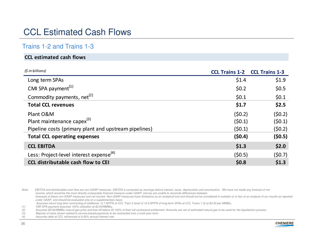 CCL Estimated Cash Flows 36 Trains 1-2 and Trains 1-3 CCL estimated cash flows ($ in billions) CCL Trains 1‐2 CCL Trains 1‐3 Long term SPAs $1.4 $1.9 CMI SPA payment(1) $0.2 $0.5 Commodity payments, net(2) $0.1 $0.1 Total CCL revenues $1.7 $2.5 Plant O&M ($0.2) ($0.2) Plant maintenance capex(3) ($0.1) ($0.1) Pipeline costs (primary plant and upstream pipelines) ($0.1) ($0.2) Total CCL operating expenses ($0.4) ($0.5) CCL EBITDA $1.3 $2.0 Less: Project‐level interest expense(4) ($0.5) ($0.7) CCL distributable cash flow to CEI $0.8 $1.3 Note: EBITDA and distributable cash flow are non-GAAP measures. EBITDA is computed as earnings before interest, taxes, depreciation and amortization. We have not made any forecast of net income, which would be the most directly comparable financial measure under GAAP, and we are unable to reconcile differences between forecasts of these non-GAAP measures and net income. Non-GAAP measures have limitations as an analytical tool and should not be considered in isolation or in lieu of an analysis of our results as reported under GAAP, and should be evaluated only on a supplementary basis. Assumes future long term contracting of additional ~2.1 MTPA at CCL Train 3 (total of 10.5 MTPA of long term SPAs at CCL Trains 1-3) at $3.50 per MMBtu. (1) CMI SPA payment assumes 100% utilization at $3.00/MMBtu. (2) Assumes $5.00/MMBtu natural gas price and that off-takers lift 100% of their full contractual entitlement. Amounts are net of estimated natural gas to be used for the liquefaction process. (3) Majority of costs shown related to service-based payments to be contracted over a multi-year term. (4) Assumes debt at CCL refinanced at 6.00% annual interest rate.