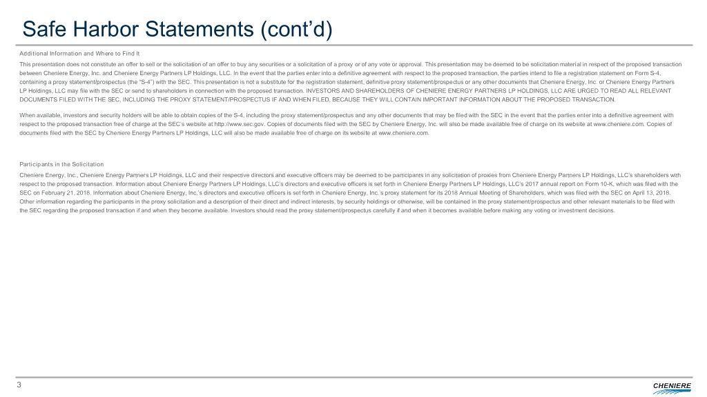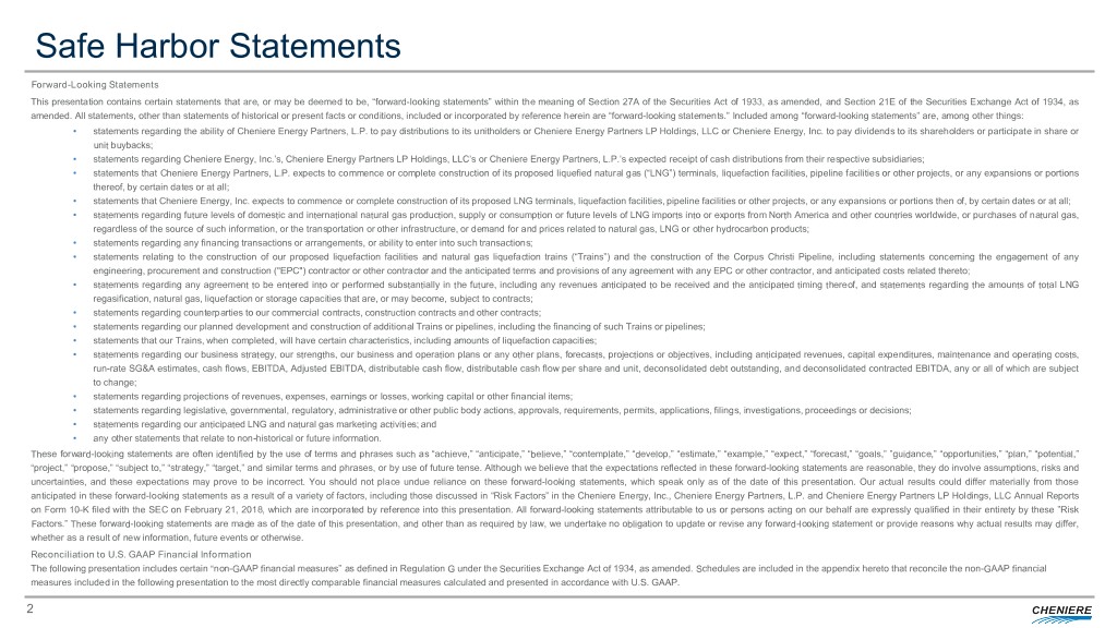 Safe Harbor Statements Forward-Looking Statements This presentation contains certain statements that are, or may be deemed to be, “forward-looking statements” within the meaning of Section 27A of the Securities Act of 1933, as amended, and Section 21E of the Securities Exchange Act of 1934, as amended. All statements, other than statements of historical or present facts or conditions, included or incorporated by reference herein are “forward-looking statements.” Included among “forward-looking statements” are, among other things: • statements regarding the ability of Cheniere Energy Partners, L.P. to pay distributions to its unitholders or Cheniere Energy Partners LP Holdings, LLC or Cheniere Energy, Inc. to pay dividends to its shareholders or participate in share or unit buybacks; • statements regarding Cheniere Energy, Inc.’s, Cheniere Energy Partners LP Holdings, LLC’s or Cheniere Energy Partners, L.P.’s expected receipt of cash distributions from their respective subsidiaries; • statements that Cheniere Energy Partners, L.P. expects to commence or complete construction of its proposed liquefied natural gas (“LNG”) terminals, liquefaction facilities, pipeline facilities or other projects, or any expansions or portions thereof, by certain dates or at all; • statements that Cheniere Energy, Inc. expects to commence or complete construction of its proposed LNG terminals, liquefaction facilities, pipeline facilities or other projects, or any expansions or portions then of, by certain dates or at all; • statements regarding future levels of domestic and international natural gas production, supply or consumption or future levels of LNG imports into or exports from North America and other countries worldwide, or purchases of natural gas, regardless of the source of such information, or the transportation or other infrastructure, or demand for and prices related to natural gas, LNG or other hydrocarbon products; • statements regarding any financing transactions or arrangements, or ability to enter into such transactions; • statements relating to the construction of our proposed liquefaction facilities and natural gas liquefaction trains (“Trains”) and the construction of the Corpus Christi Pipeline, including statements concerning the engagement of any engineering, procurement and construction ("EPC") contractor or other contractor and the anticipated terms and provisions of any agreement with any EPC or other contractor, and anticipated costs related thereto; • statements regarding any agreement to be entered into or performed substantially in the future, including any revenues anticipated to be received and the anticipated timing thereof, and statements regarding the amounts of total LNG regasification, natural gas, liquefaction or storage capacities that are, or may become, subject to contracts; • statements regarding counterparties to our commercial contracts, construction contracts and other contracts; • statements regarding our planned development and construction of additional Trains or pipelines, including the financing of such Trains or pipelines; • statements that our Trains, when completed, will have certain characteristics, including amounts of liquefaction capacities; • statements regarding our business strategy, our strengths, our business and operation plans or any other plans, forecasts, projections or objectives, including anticipated revenues, capital expenditures, maintenance and operating costs, run-rate SG&A estimates, cash flows, EBITDA, Adjusted EBITDA, distributable cash flow, distributable cash flow per share and unit, deconsolidated debt outstanding, and deconsolidated contracted EBITDA, any or all of which are subject to change; • statements regarding projections of revenues, expenses, earnings or losses, working capital or other financial items; • statements regarding legislative, governmental, regulatory, administrative or other public body actions, approvals, requirements, permits, applications, filings, investigations, proceedings or decisions; • statements regarding our anticipated LNG and natural gas marketing activities; and • any other statements that relate to non-historical or future information. These forward-looking statements are often identified by the use of terms and phrases such as “achieve,” “anticipate,” “believe,” “contemplate,” “develop,” “estimate,” “example,” “expect,” “forecast,” “goals,” ”guidance,” “opportunities,” “plan,” “potential,” “project,” “propose,” “subject to,” “strategy,” “target,” and similar terms and phrases, or by use of future tense. Although we believe that the expectations reflected in these forward-looking statements are reasonable, they do involve assumptions, risks and uncertainties, and these expectations may prove to be incorrect. You should not place undue reliance on these forward-looking statements, which speak only as of the date of this presentation. Our actual results could differ materially from those anticipated in these forward-looking statements as a result of a variety of factors, including those discussed in “Risk Factors” in the Cheniere Energy, Inc., Cheniere Energy Partners, L.P. and Cheniere Energy Partners LP Holdings, LLC Annual Reports on Form 10-K filed with the SEC on February 21, 2018, which are incorporated by reference into this presentation. All forward-looking statements attributable to us or persons acting on our behalf are expressly qualified in their entirety by these ”Risk Factors.” These forward-looking statements are made as of the date of this presentation, and other than as required by law, we undertake no obligation to update or revise any forward-looking statement or provide reasons why actual results may differ, whether as a result of new information, future events or otherwise. Reconciliation to U.S. GAAP Financial Information The followin