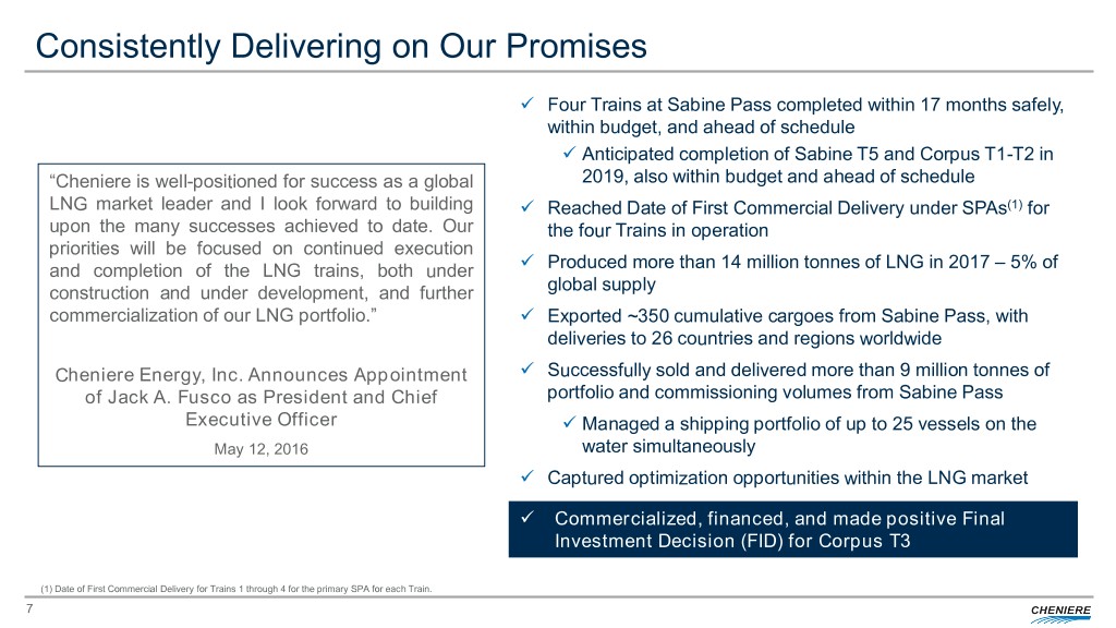 Cheniere Investment Thesis Full-service LNG offering, including gas procurement, transportation, liquefaction, and shipping enables flexible solutions tailored to customer needs Positioned as premier LNG provider, with a proven track record and low- cost advantage through capacity expansion at existing sites Liquefaction platform offers excellent visibility for long-term cash flows, with “take-or-pay” style agreements with creditworthy counterparties Opportunities for future cash flow growth at attractive returns, utilizing uncontracted incremental production and constructing additional Trains Supply/demand fundamentals support continued LNG demand growth worldwide, with forecast global LNG trade growth of >200 mtpa by 2030 Investments in additional infrastructure upstream and downstream of liquefaction along the LNG value chain Source: Cheniere Research, EIA, Cheniere interpretation of Wood Mackenzie data (Q1 2018), IHS, GIIGNL 6