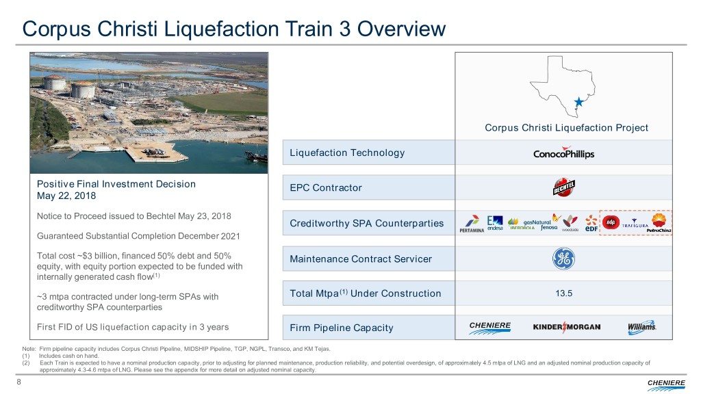 Consistently Delivering on Our Promises Four Trains at Sabine Pass completed within 17 months safely, within budget, and ahead of schedule Anticipated completion of Sabine T5 and Corpus T1-T2 in “Cheniere is well-positioned for success as a global 2019, also within budget and ahead of schedule LNG market leader and I look forward to building Reached Date of First Commercial Delivery under SPAs(1) for upon the many successes achieved to date. Our the four Trains in operation priorities will be focused on continued execution and completion of the LNG trains, both under Produced more than 14 million tonnes of LNG in 2017 – 5% of construction and under development, and further global supply commercialization of our LNG portfolio.” Exported ~350 cumulative cargoes from Sabine Pass, with deliveries to 26 countries and regions worldwide Cheniere Energy, Inc. Announces Appointment Successfully sold and delivered more than 9 million tonnes of of Jack A. Fusco as President and Chief portfolio and commissioning volumes from Sabine Pass Executive Officer Managed a shipping portfolio of up to 25 vessels on the May 12, 2016 water simultaneously Captured optimization opportunities within the LNG market Commercialized, financed, and made positive Final Investment Decision (FID) for Corpus T3 (1) Date of First Commercial Delivery for Trains 1 through 4 for the primary SPA for each Train. 7