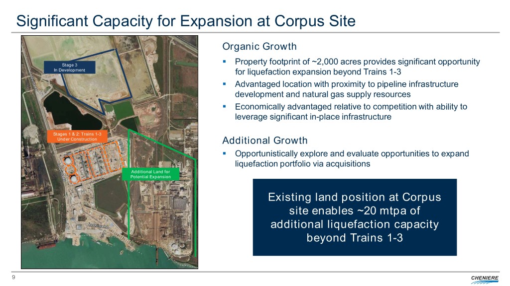 Corpus Christi Liquefaction Train 3 Overview Corpus Christi Liquefaction Project Liquefaction Technology Positive Final Investment Decision EPC Contractor May 22, 2018 Notice to Proceed issued to Bechtel May 23, 2018 Creditworthy SPA Counterparties Guaranteed Substantial Completion December 2021 Total cost ~$3 billion, financed 50% debt and 50% Maintenance Contract Servicer equity, with equity portion expected to be funded with internally generated cash flow(1) (1) ~3 mtpa contracted under long-term SPAs with Total Mtpa Under Construction 13.5 creditworthy SPA counterparties First FID of US liquefaction capacity in 3 years Firm Pipeline Capacity Note: Firm pipeline capacity includes Corpus Christi Pipeline, MIDSHIP Pipeline, TGP, NGPL, Transco, and KM Tejas. (1) Includes cash on hand. (2) Each Train is expected to have a nominal production capacity, prior to adjusting for planned maintenance, production reliability, and potential overdesign, of approximately 4.5 mtpa of LNG and an adjusted nominal production capacity of approximately 4.3-4.6 mtpa of LNG. Please see the appendix for more detail on adjusted nominal capacity. 8