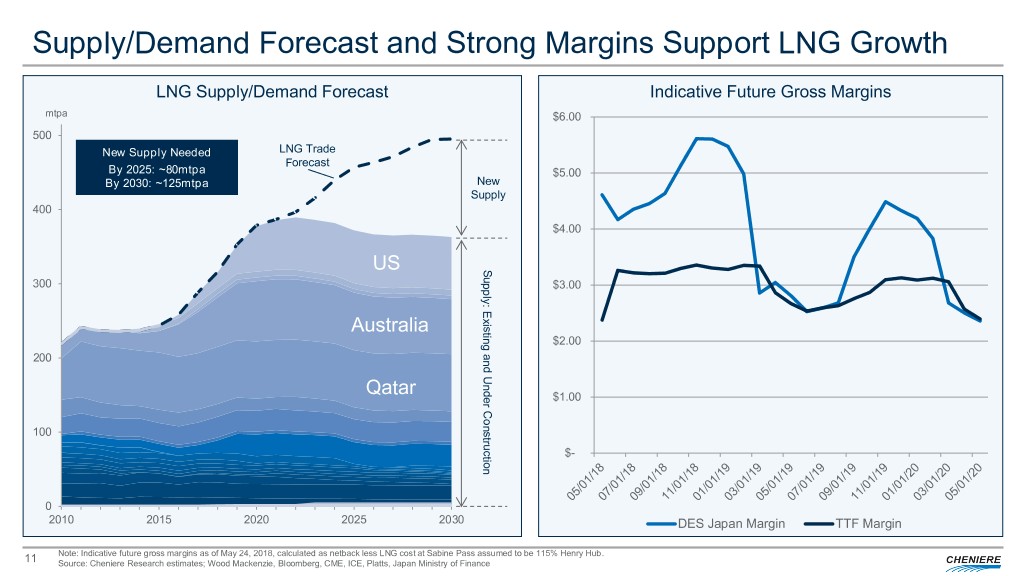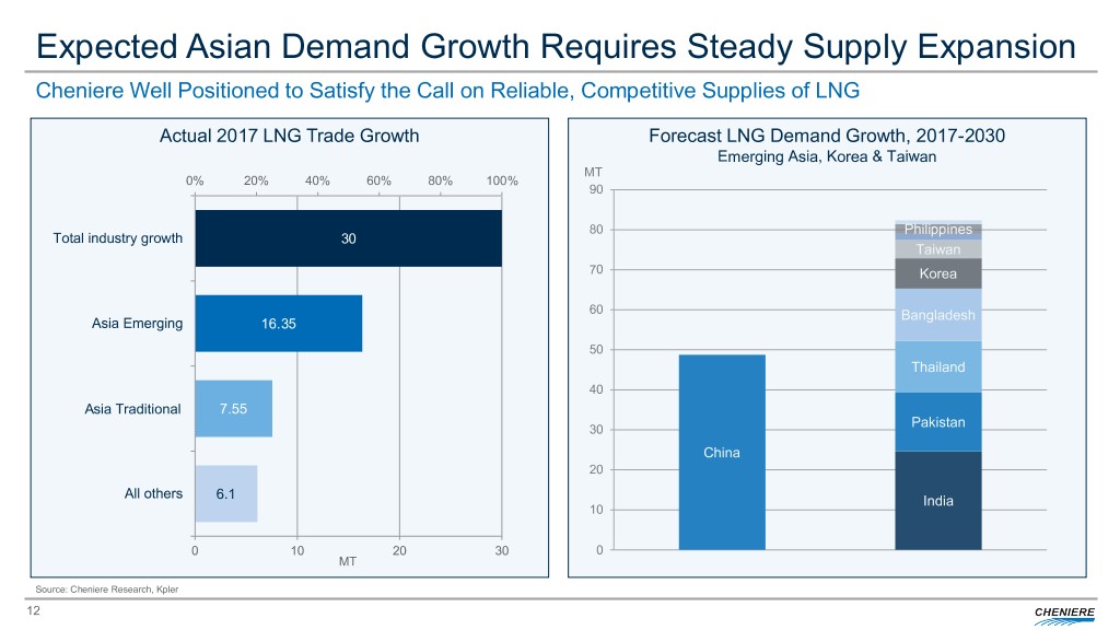 Supply/Demand Forecast and Strong Margins Support LNG Growth LNG Supply/Demand Forecast Indicative Future Gross Margins mtpa $6.00 500 New Supply Needed LNG Trade Forecast By 2025: ~80mtpa $5.00 By 2030: ~125mtpa New Supply 400 $4.00 US and Under Construction Existing Supply: 300 $3.00 Australia $2.00 200 Qatar $1.00 100 $- 0 2010 2015 2020 2025 2030 DES Japan Margin TTF Margin Note: Indicative future gross margins as of May 24, 2018, calculated as netback less LNG cost at Sabine Pass assumed to be 115% Henry Hub. 11 Source: Cheniere Research estimates; Wood Mackenzie, Bloomberg, CME, ICE, Platts, Japan Ministry of Finance