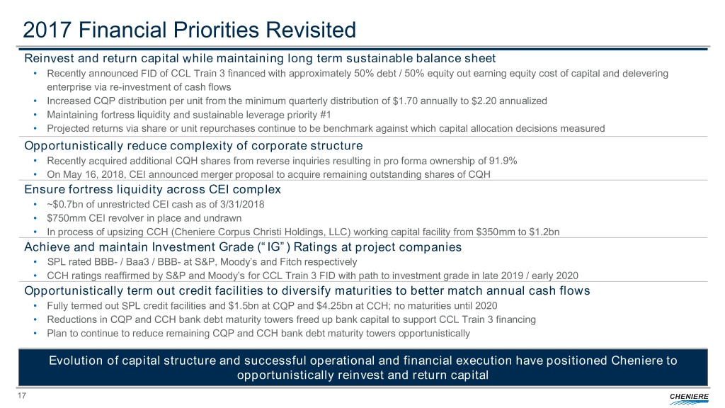 2018 Investor Update . 2017 Finance Priorities Revisited . CCL Train 3 Financing . Run-Rate Guidance Update . Five-Year Available Cash Update 16