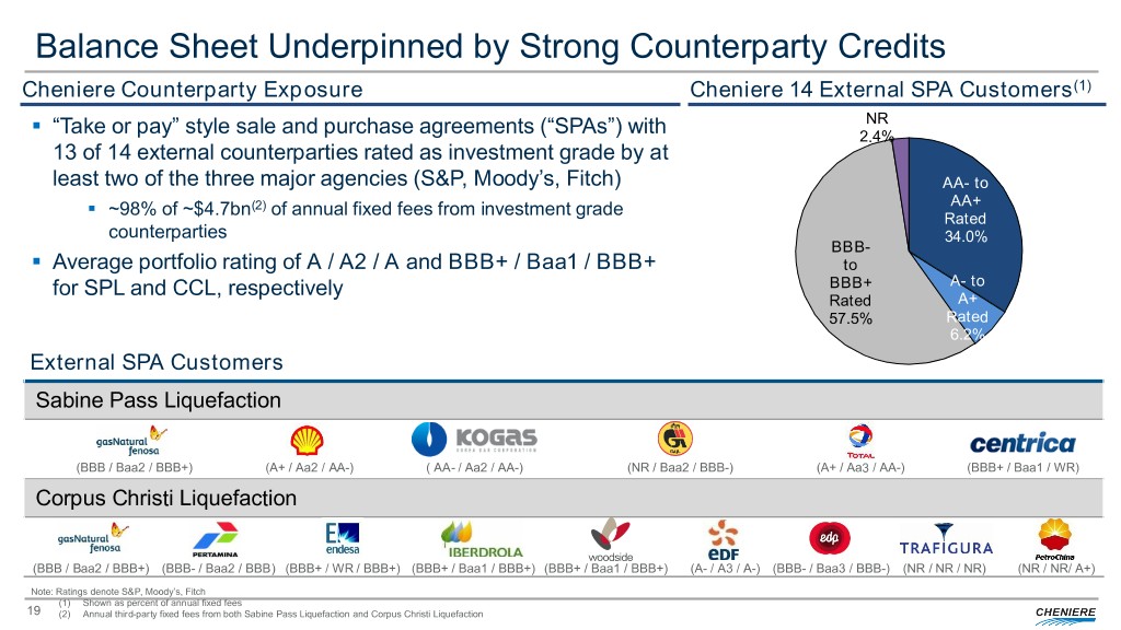 CCH Trains 1-3 Sources and Uses CCH Trains 1-3 Financing – Sources and Uses(3) Sources ($bn) T1-2 T3 Total % Uses ($bn) T1-2 T3 Total % Upfront / Development Equity Funded $1.7 $0.3 $2.1 13% Bechtel EPC Contracts $7.8 $2.4 $10.2 65% Equity Contribution Agreement(1) $1.1 $0.5 $1.6 10% Pipeline Costs $0.4 – $0.4 2% Operational Cashflows $0.7 $0.8 $1.6 10% Owner's Cost / Other $1.2 $0.3 $1.5 10% Equity Funding $3.6 $1.6 $5.2 Contingencies $0.2 $0.2 $0.5 3% Term Loan - Bank Debt(1) $4.6 $1.6 $6.1 39% Unlevered Costs $9.6 $2.9 $12.5 Capital Markets $4.3 – $4.3 27% Financing Fees & IDC(2) $2.8 $0.3 $3.1 20% Total Sources $12.4 $3.2 $15.6 100% Total Uses $12.4 $3.2 $15.6 100% CCH Trains 1-3 Debt Profile $8.0 $7.0 CCH credit facilities pushed out by 2 years Plan to continue to reduce CCH bank debt maturity $1.6 $6.0 to 2024 and upsized upon FID of Train 3 towers opportunistically $5.0 $4.0 $4.6 $3.0 ~$1.6bn Projected CCH Run-Rate Adjusted EBITDA $2.0 $4.6 ($ in billions) $1.0 $1.3 $1.5 $1.5 $0.0 2018 2019 2020 2021 2022 2023 2024 2025 2026 2027 2028 2029 2030 2031 2032 Existing CCH credit facility Incremental CCH credit facility Existing CCH Bonds Note: Projected CCH Run-Rate EBITDA assumes CMI sales at $2.50 / MMBtu at 4.5 mtpa. (1) Equity Contribution Agreement and Term Loan invested in project to date approximately ~$0.5bn and ~$2.8bn, respectively. (2) IDC includes all interest until conclusion of Train 3 construction. 18 (3) Totals may not sum due to rounding.